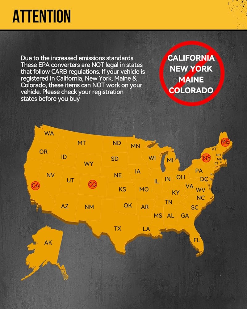 Attention - Our catalytic converters have strict production procedures and comply with EPA standards and Obd3 standards. However, due to the increased emission standards in California, Colorado, New York, and Maine, no sales were carried out in these states.