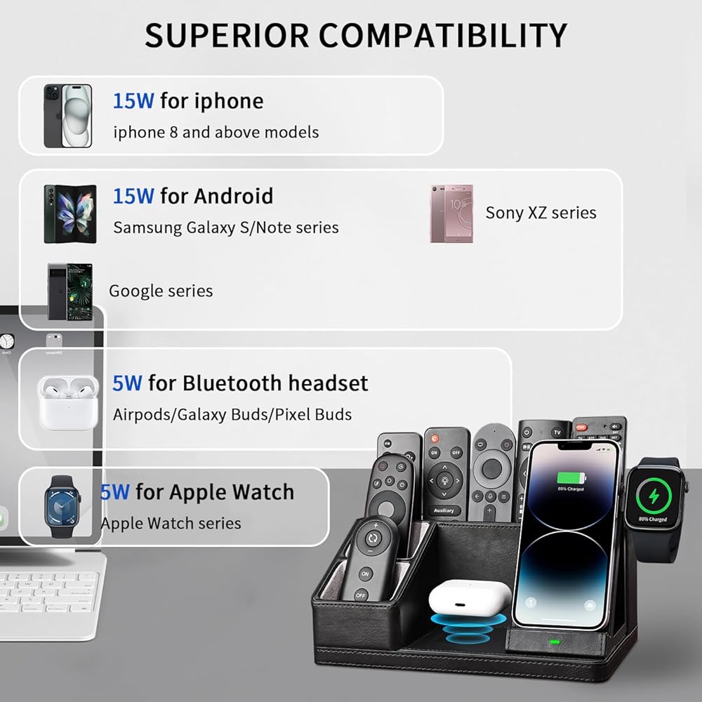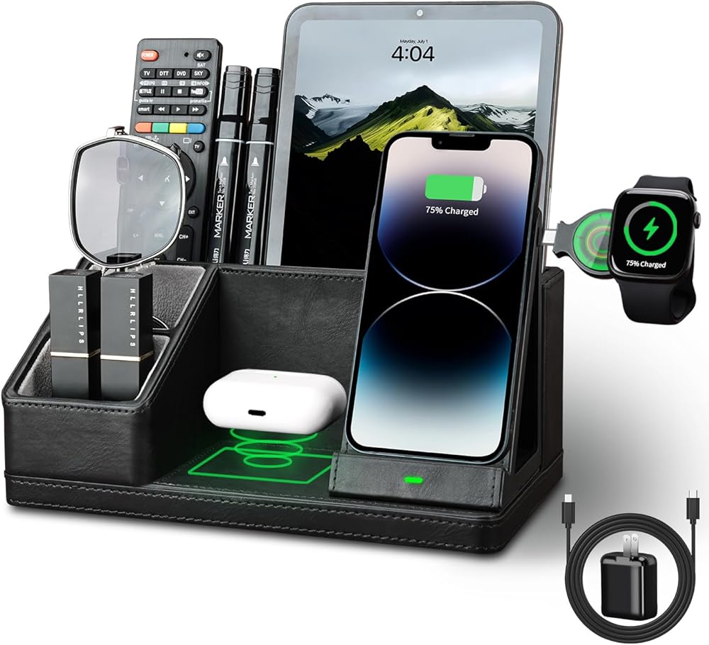 ▶【Multi-Functional Organizer with Charging Station】: This all-in-one desk organizer with wireless charging station, with dedicated spots made for your iPhone/Apple Watch/AirPods charging at the same time; and keeping your pens, remote control, glasses, and other daily-used small things. Say goodbye to tangled cords and enjoy wireless charging by simply laying your device on the charging stand, no more plug-in/ out troubles.