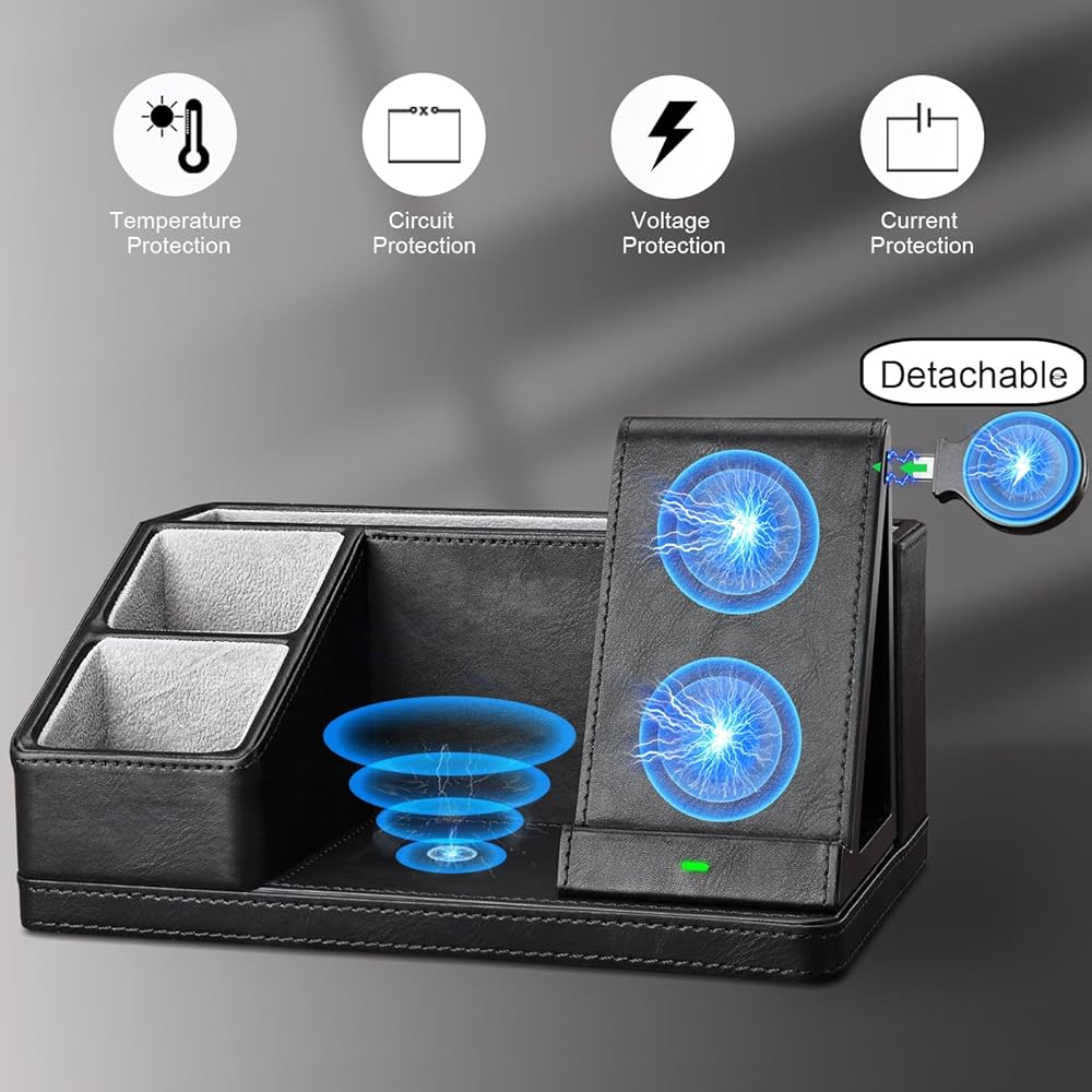 ▶【 Sturdy & Durable Office Supplies Organizer】: The black desk organizer surface is made of high-quality PU leather with MDF construction, and the interior with soft flannel. Non-slip and dirt-resistant exterior is easy to wipe clean with a damp rag. The wireless charging station is equipped with an anti-over current, anti-overheating, anti-short circuit, and anti-overvoltage. Attractive and thoughtful design office decor box for desktop.