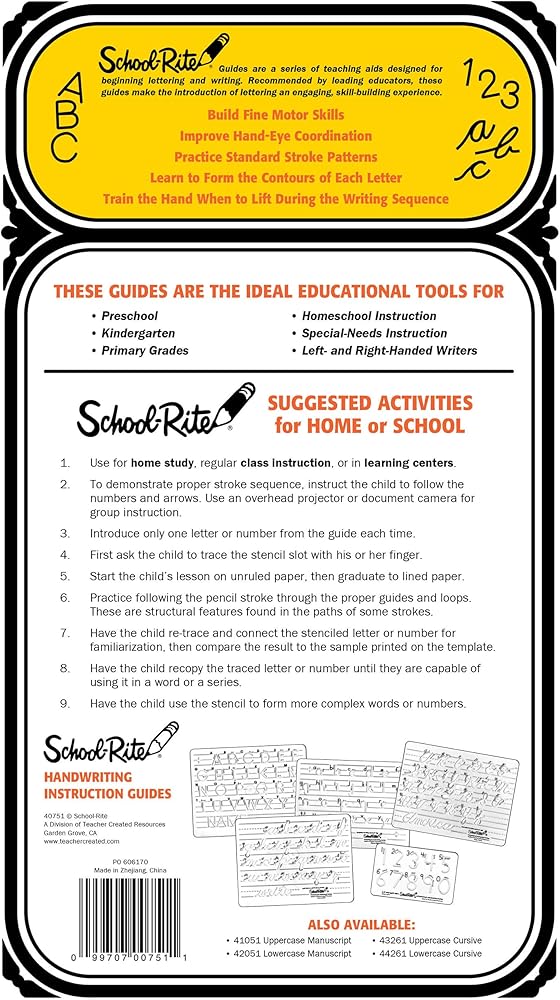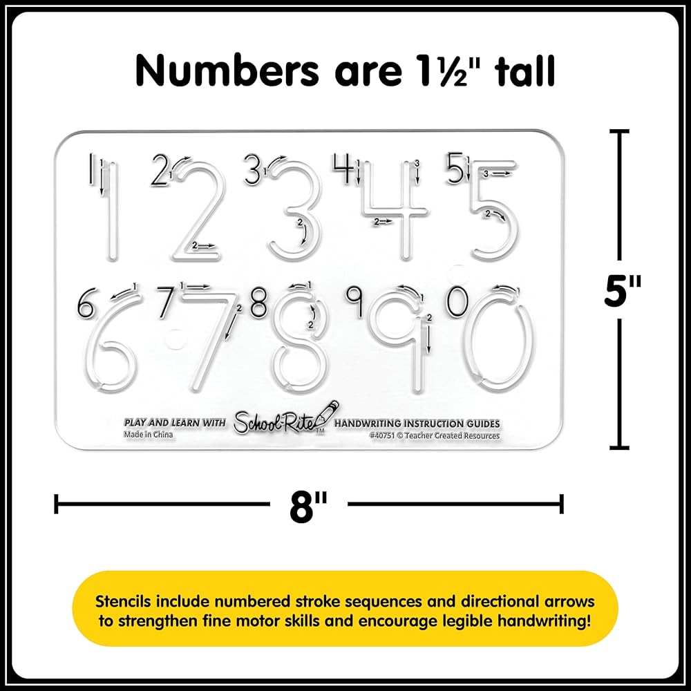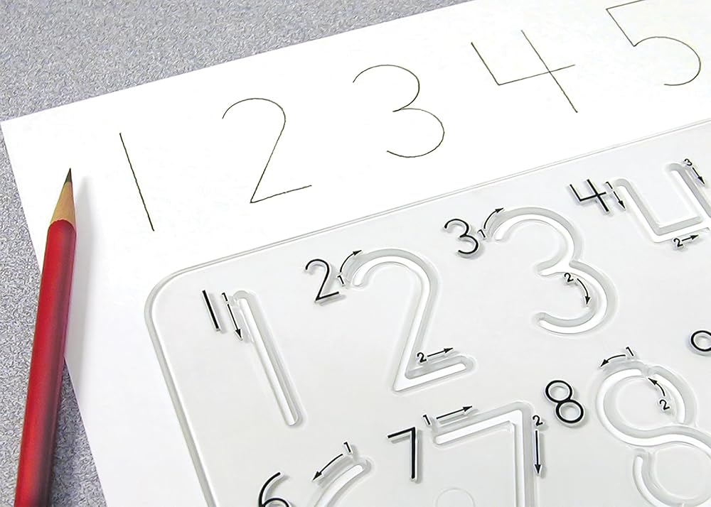 Help your child practice handwriting - and develop sound writing habits! As kids trace the numbers on this ingenious template, they can't help but learn proper stroke patterns. Great coordination builder! For ages 3 and up. Includes one numbers template and two pencils. Pliable templates help kids learn the correct "feel" of writing numbers Templates feature illustrated step-by-step instructions Cutouts force little hands to lift where it normally occurs in the writing sequence Wipe clean Allows proper pencil slant Works equally well for righties and lefties Numbers template (8"L x 5"W) includes numbers 0-9; numbers are approximately 1 1/2"H