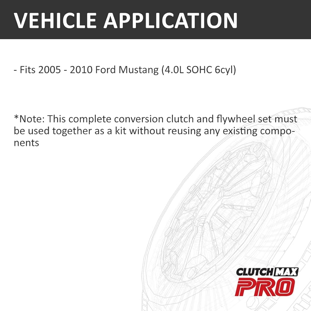 Vehicle Application Fits 2005- 2010 Ford Mustang(4.0L SOHC6cyl)Note: This conversion clutch and flywheel set must be used together as a kit without reusing any existing components About ClutchMax PRO ClutchMax PROhas 20+ years of history supplying very best clutch products to top tierclutch brands in Japan, UK, Australia and U.S.ClutchMax PROhas taken this experience and a new approach to re-engineer performance clutch industry and is now one of the fastest growing performance clutch company in the world. Compatible model and year list Please enter your Year, Make and Model above using s My Garage tool - the tool will specify which clutch kit fits your vehicle Questions or Concerns If you have any questions/concerns, message us using s contact seller form. We respond to all messages within 24 hours.