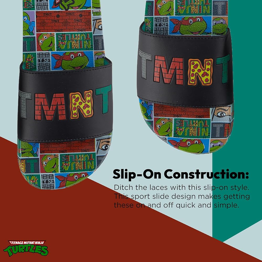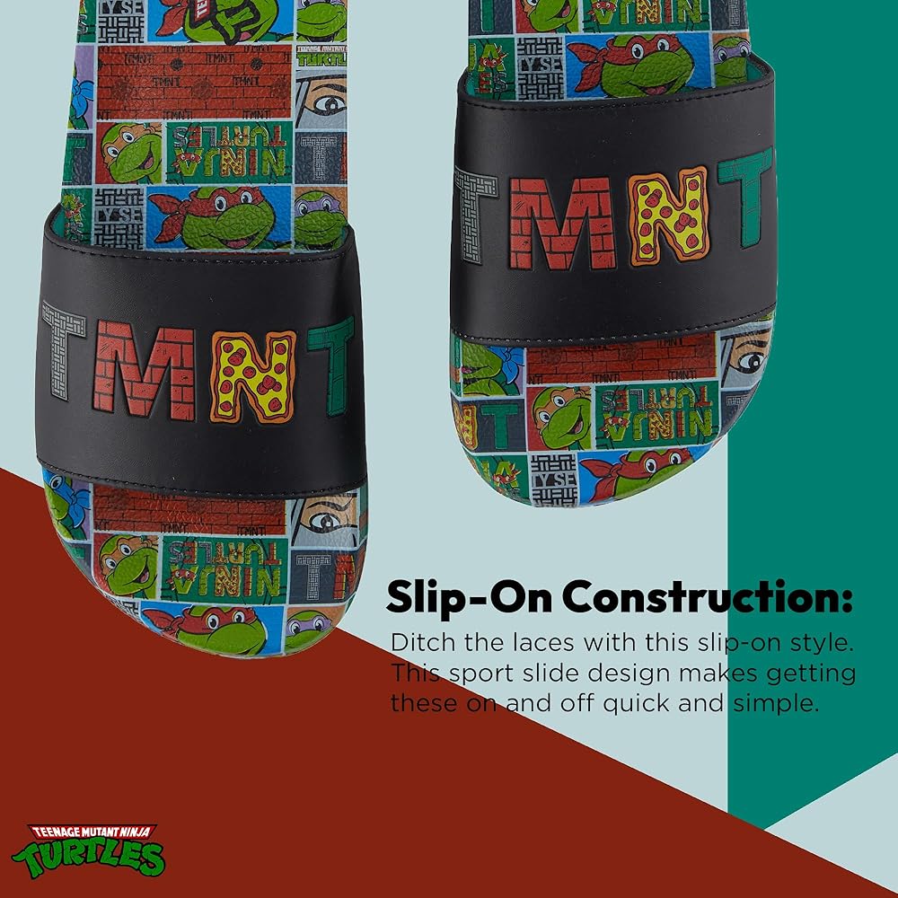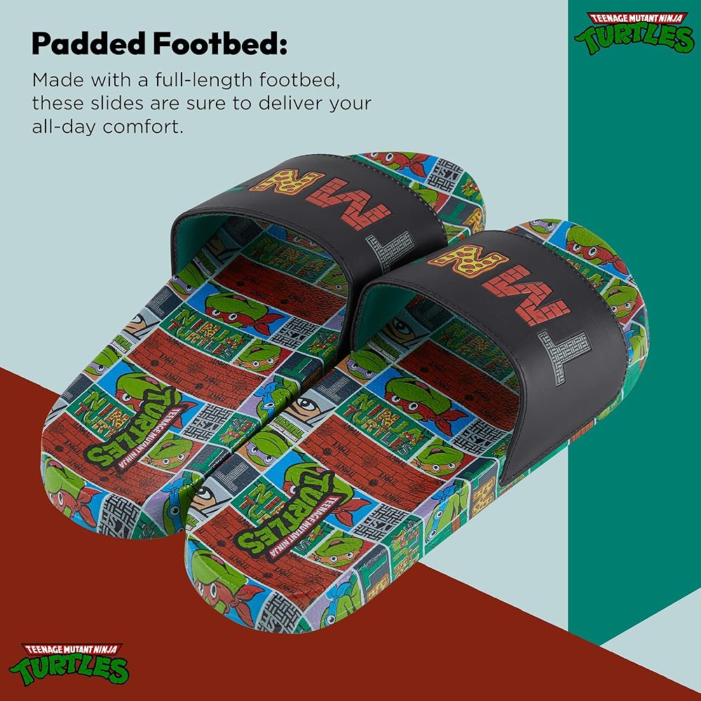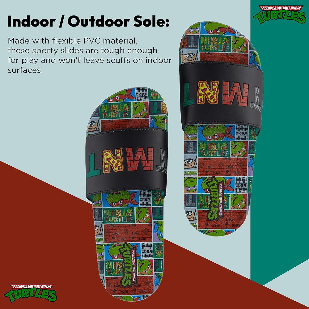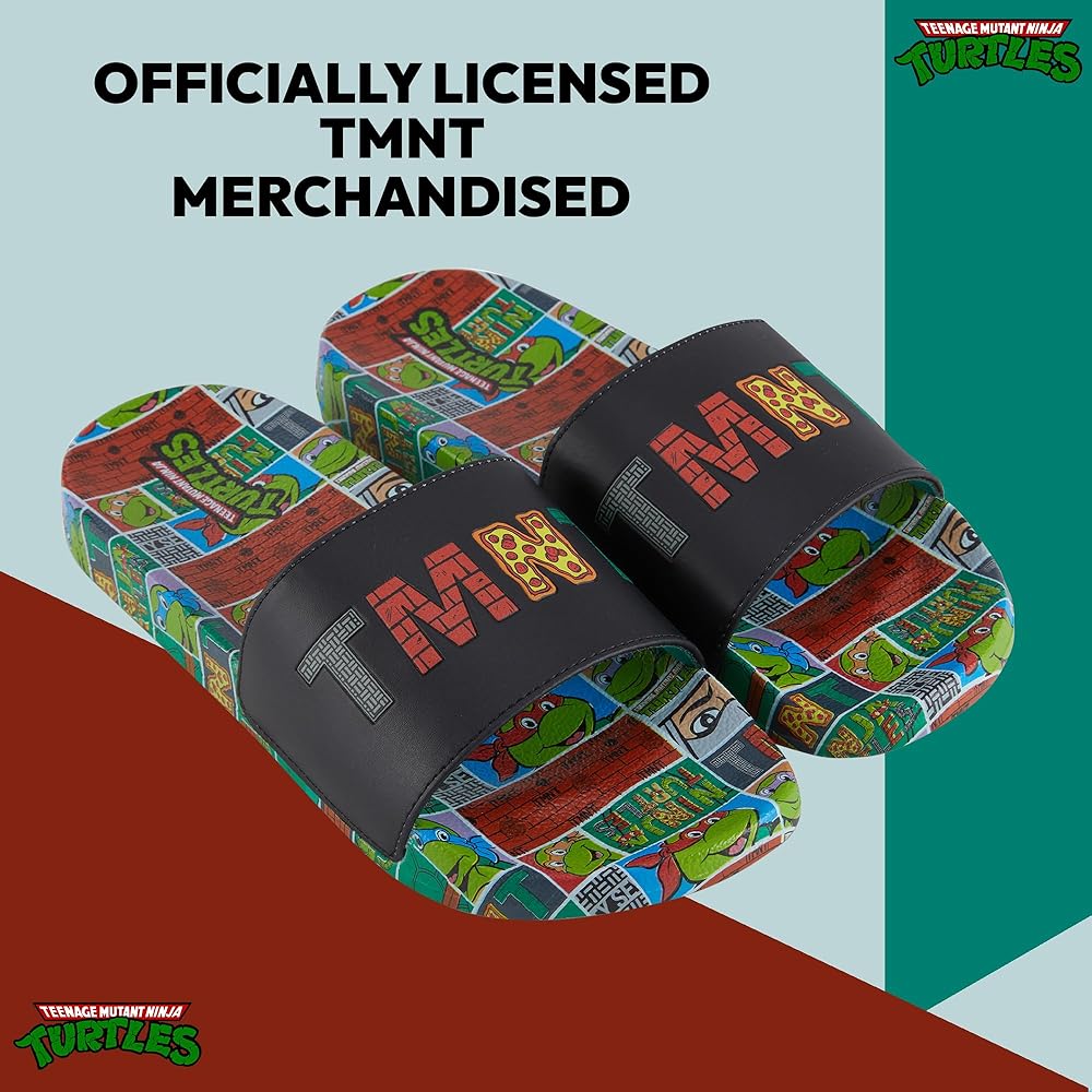 Officially licensed merch and high-quality prints on these Nickelodeon Teenage Mutant Ninja Turtles slide sandals make it the perfect gift for adults everywhere. Whether it be for and achievement, Halloween, Christmas or a birthday.