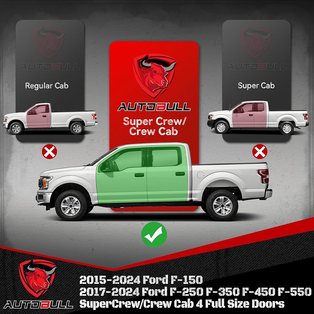 Fitment- Truck running boards compatible with 2015-2024 Ford F150 F 150, 2017-2024 Ford F250 F350 Super Duty SuperCrew/Crew Cab 4 Full Size Doors. Please check the cab picture in the listing before ordering.