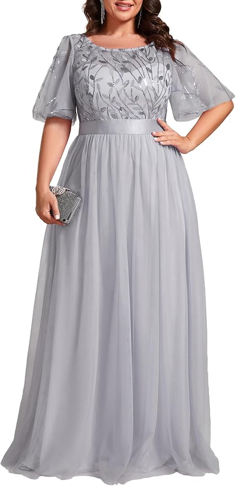 This plus size formal dress features a round neck and ruffles sleeves, providing a flattering and stylish look for a variety of body types. The dress is embellished with sequins and detailed embroidery, giving it a luxurious and eye-catching appearance. Made with tulle and designed in an A-line maxi cut, this dress offers a comfortable and elegant option for formal evening events, perfect for those seeking a sophisticated and size-inclusive style.