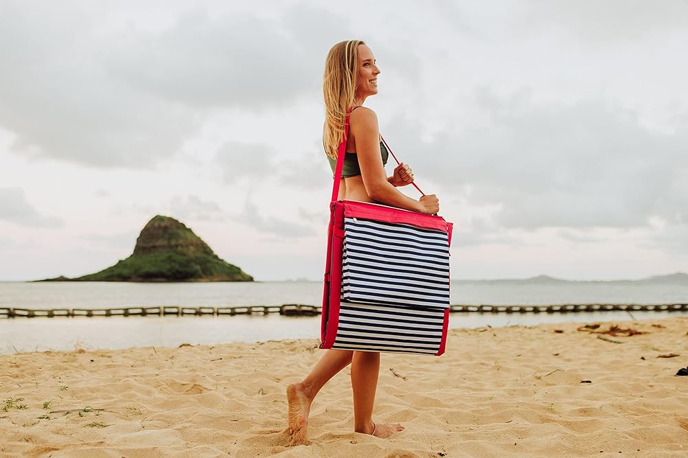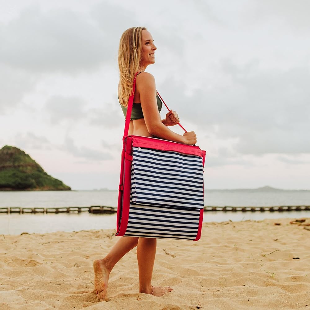 The Beachcomber Beach Mat, a lightweight and portable folding beach lounger with a fully-padded and adjustable backrest set on an inner steel frame, is the perfect compromise between a beach chair and a towel. Ideal for the sunbather who wants to lay out without missing all the action! A large zippered pocket holds your phone and sunglasses, and the shoulder strap makes this beach lounge chair easy to carry anywhere.