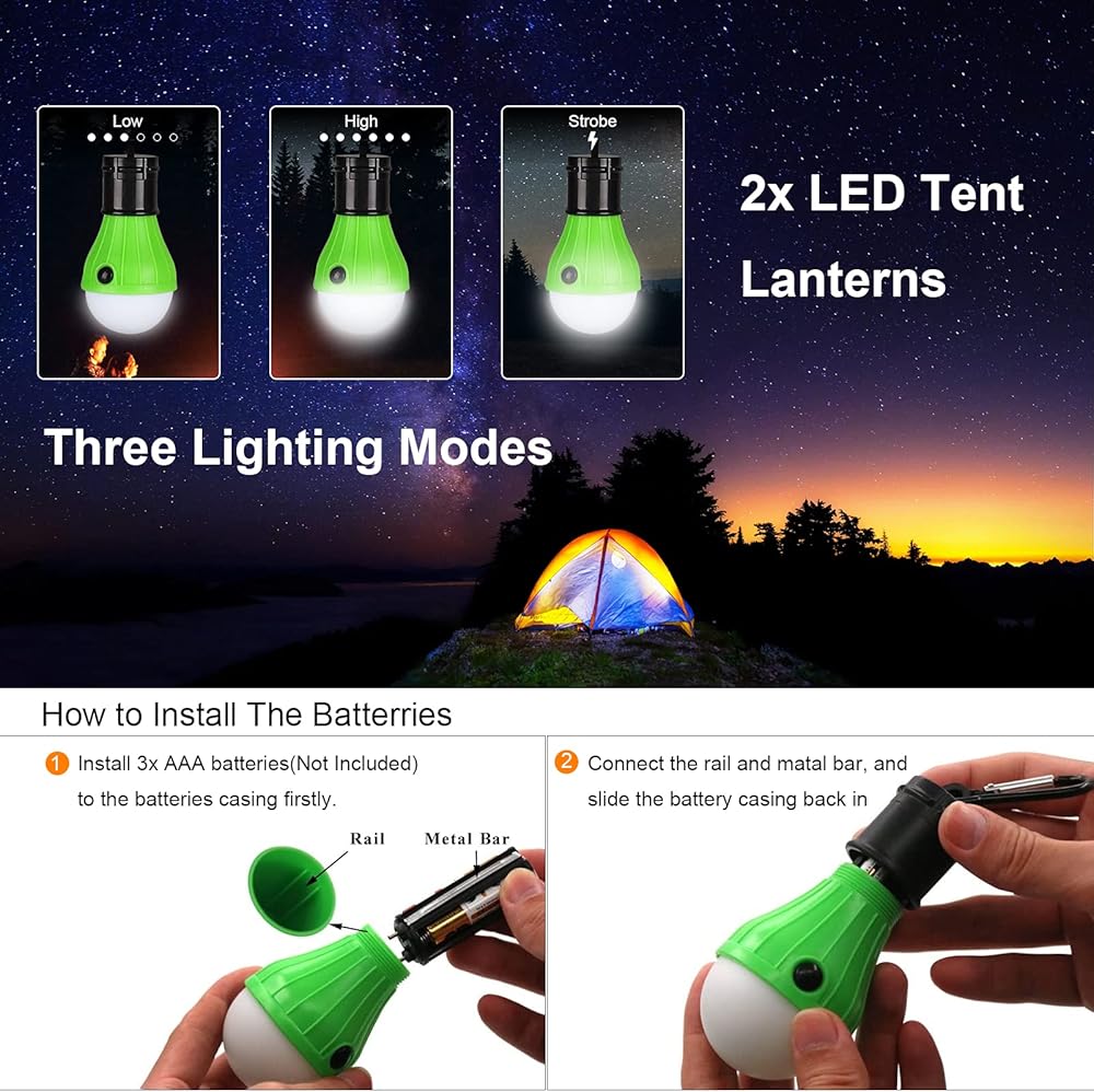 【Extra LED Camping Lights】Contained 2 PCS LED tent Lights with 3 modes. High / Low / Strobe. It can illuminate a large area, as (SOS)emergency lights or create flashing party air. Perfect camping gear fits different needs.