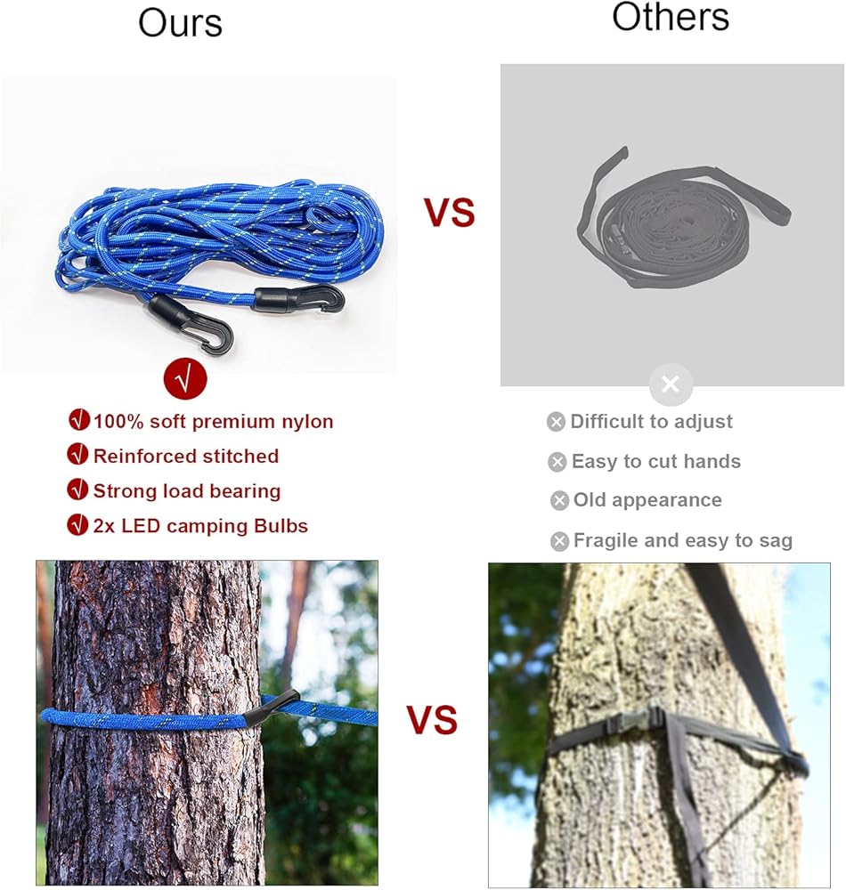 【Easy installation】There are hooks at both ends of the rope. Just wrap both ends of the rope around the tree and then use snap together with buckle. With an adjustable length of 16 feet, you can adjust the length of the lanyard according to the required length and tightness, or tie it directly to the loops on the tree.