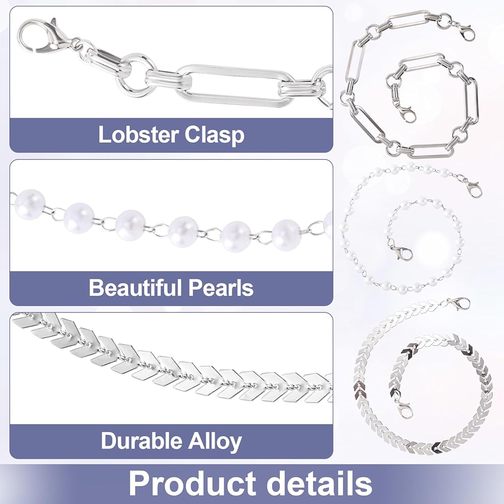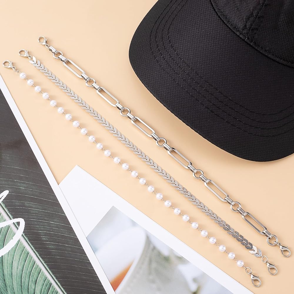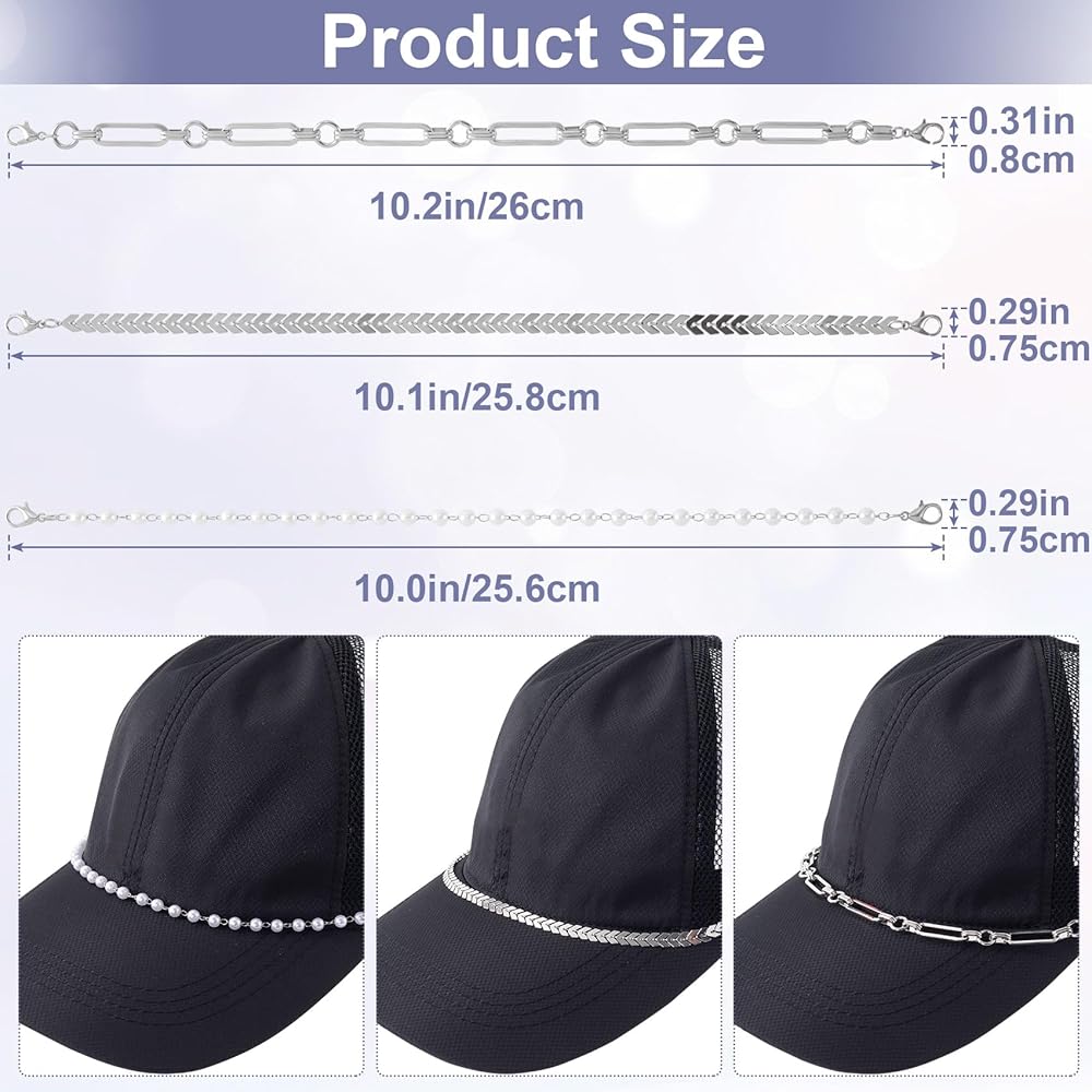 Joez Wonderful 3 Pcs Trucket Hat Chains, Decorative Chain Accessory for Caps, Bulk DIY Tucker Cap Charms, Pearl and Stainless Steel Tucker Hat Bar Supplies for Baseball Cap