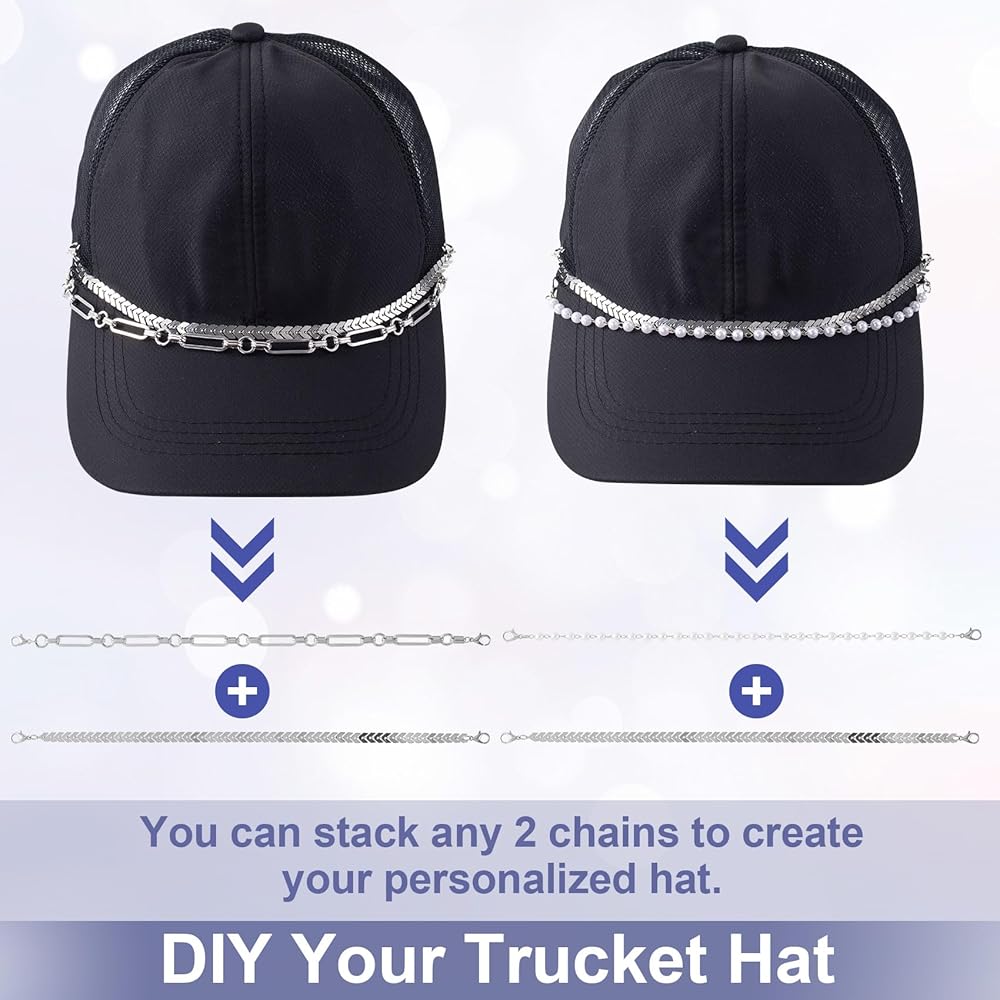 Package Included: 3 Pcs trucket hat chains in 3 different styles, they are wheat, wheel chain and pearl style. You can use one of them with a hat or combine them.