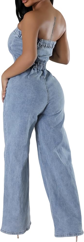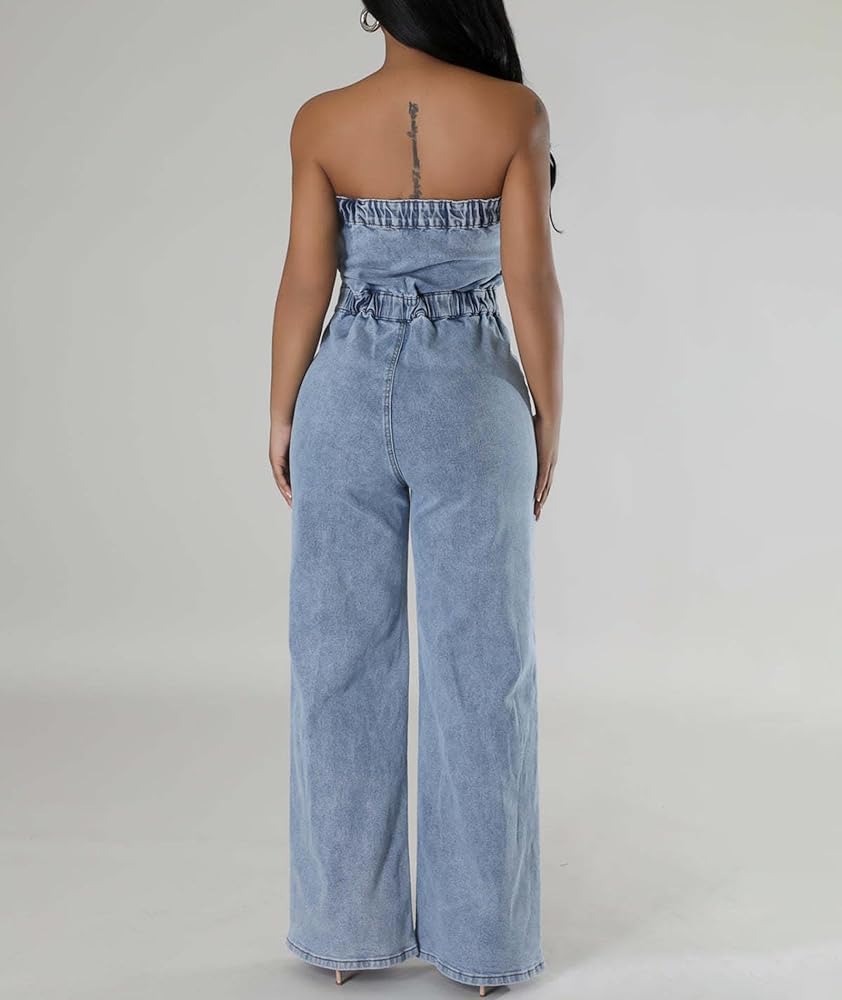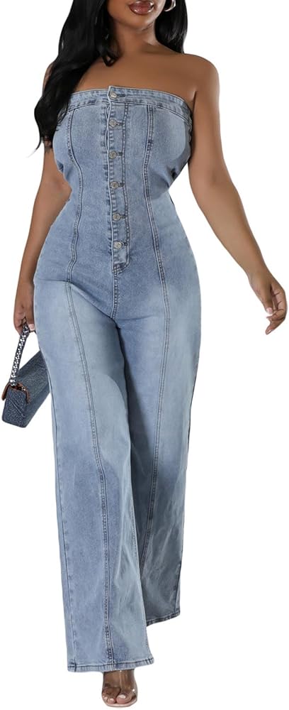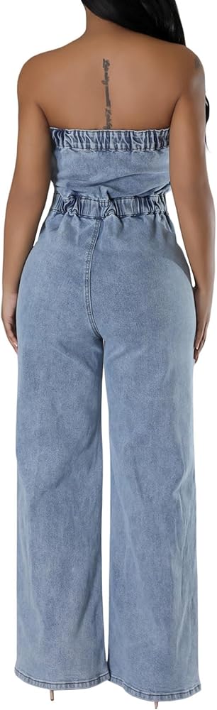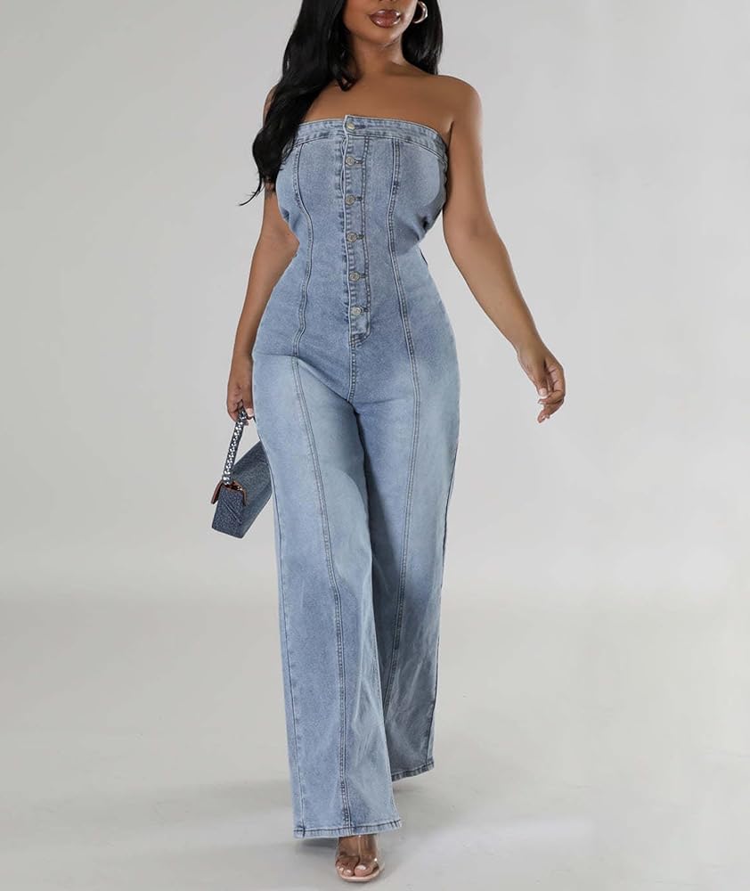 ★☆Features&Design☆★ Sleeveless, Off Shoulder, Front Button Closure, Wide Leg, One Piece Jeans Overalls, Casual Denim Jumpsuit
