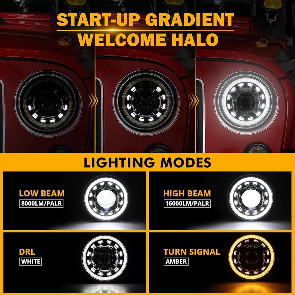 【STAND OUT DESIGN】The JK LED headlights feature a unique start-up gradient welcome halo, adding a sense of ceremony when you turn on the lights. Unlike the dull design of traditional headlights, the overall appearance of the customized Auxbeam 7 inch headlight kit is composed of multiple modules, making it not only a headlight but also a statement piece that makes your car look high-end and unique. You'll definitely turn heads on the road.