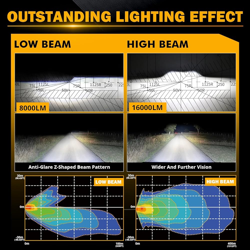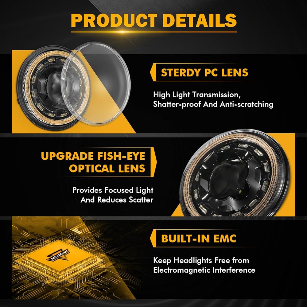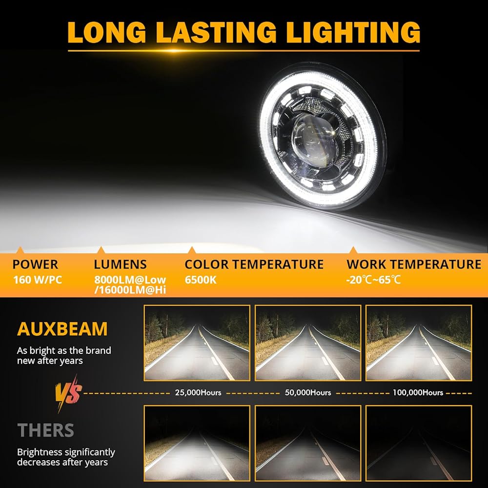 【LIGHT UP YOUR WAY】The Auxbeam 7 inch headlight is your perfect road companion with its 4 lighting modes: high beam (16000lm), low beam (8000lm), DRL, and turn signal. It's equipped with high-power LED chips, giving you the best beam out there. The low beam's Z-shaped cut-off line prevents glare, ensuring safety for you and others. The high beam offers bright, far-reaching, and uniform illumination, eliminating blind spots or dark areas. You'll get a clear view day or night.