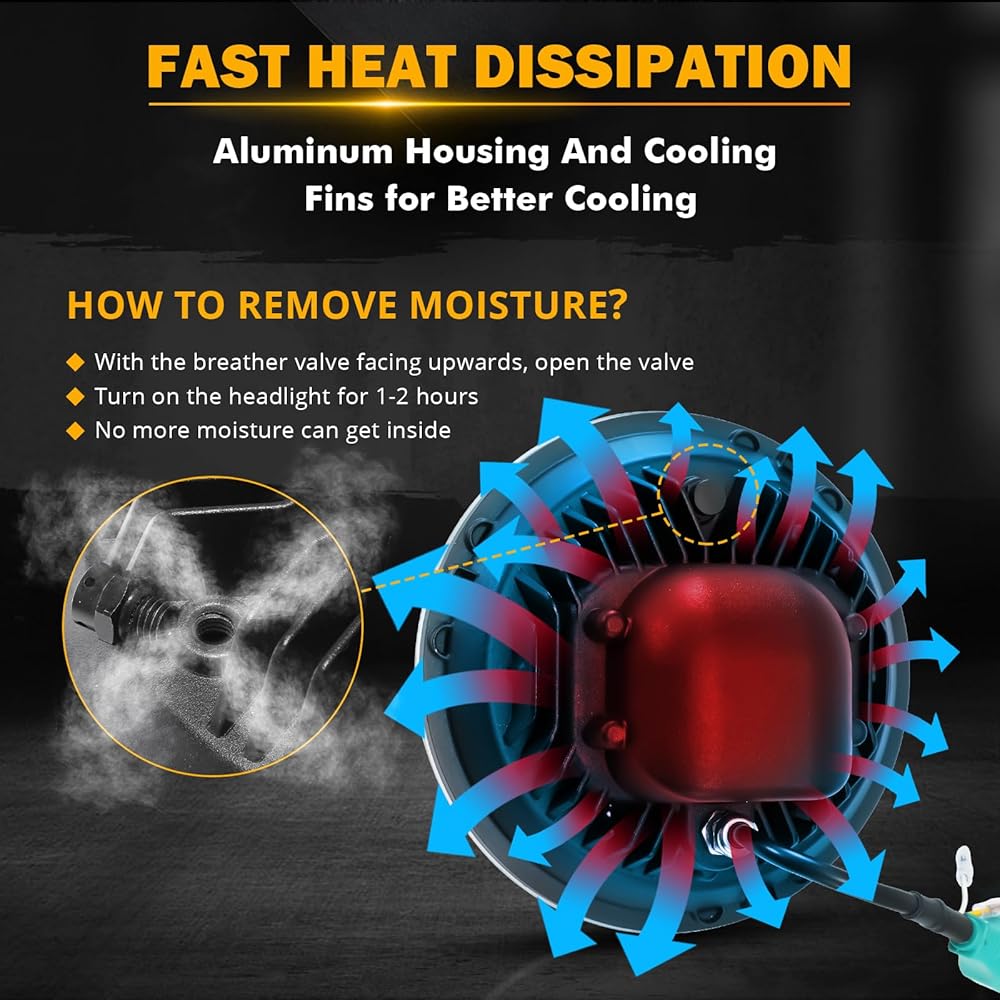 【BUILT TO LAST】With an IP67 waterproof rating, this fully sealed 7 inch LED headlight can withstand any harsh conditions. Its PC lens ensures better light transmission and is shatterproof and scratch-resistant. The aviation-grade aluminum shell and built-in heat dissipation module ensure a longer lifespan of over 100,000 hours. Even after a decade, it'll still shine as bright as new. Moreover, our headlights come with an integrated EMC anti-flicker that effectively guarantees no interference.