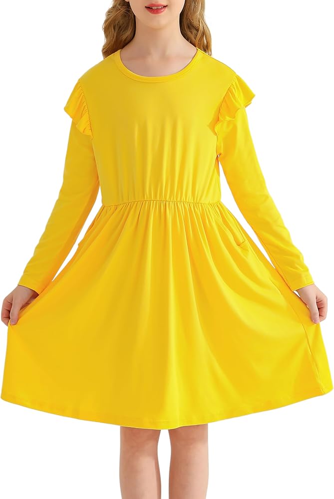 The girls dress features scoop neckline, elastic waist, flutter sleeves, ruffle design on top, hidden pockets on both sides and proper knee length, while the solid colour scheme makes the girl look more energetic.
