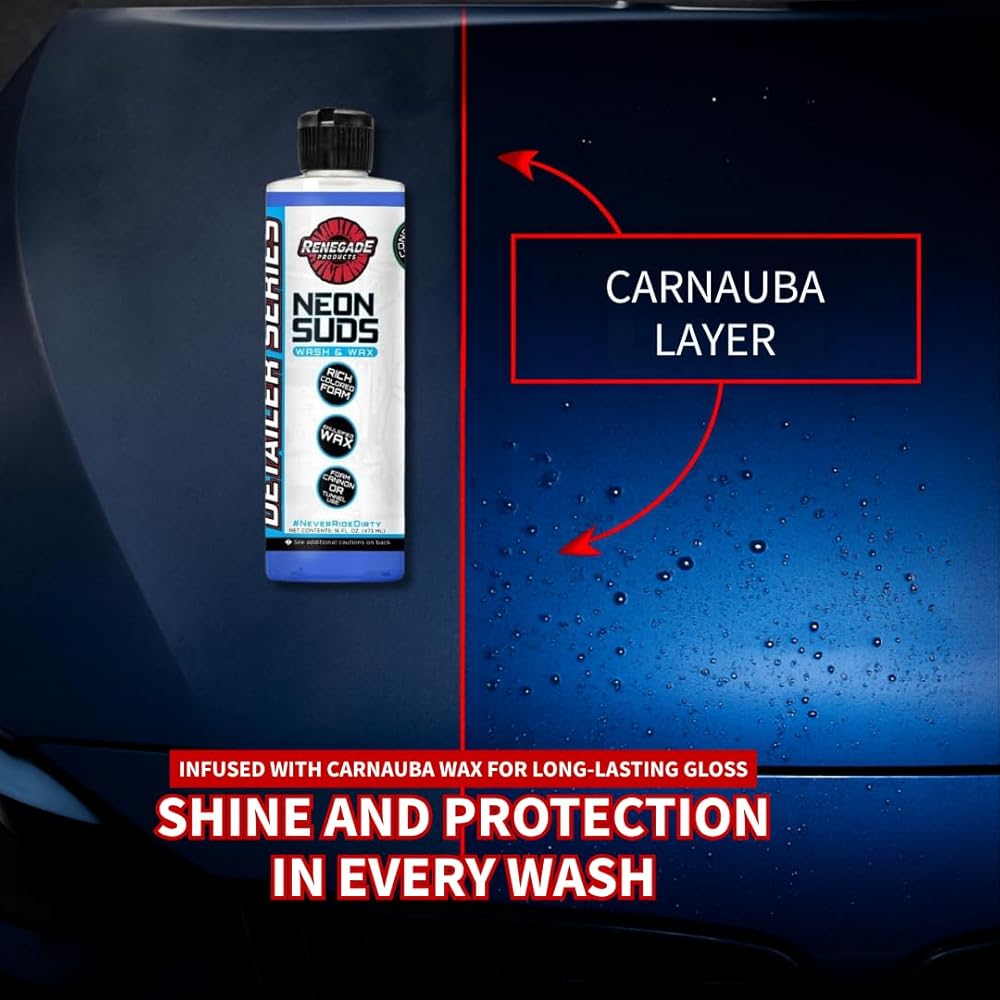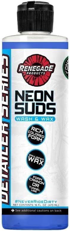 Unleash vibrant suds with Renegade's Neon Suds Colored Wash & Wax. Designed for foam cannons and car wash tunnels, this unique car wash soap combines vibrant colors with the protective qualities of carnauba wax for a dazzling finish. Safe on all paint colors, including white, it's perfect for professional and amateur detailers alike. Embrace the neon and turn car washing into a visual spectacle!
