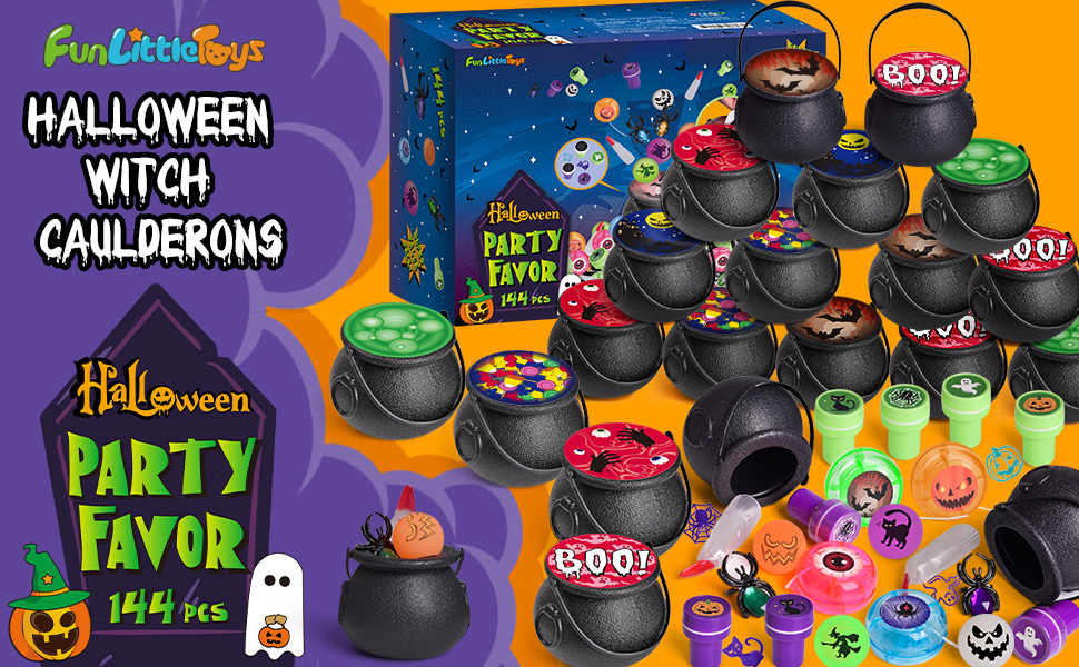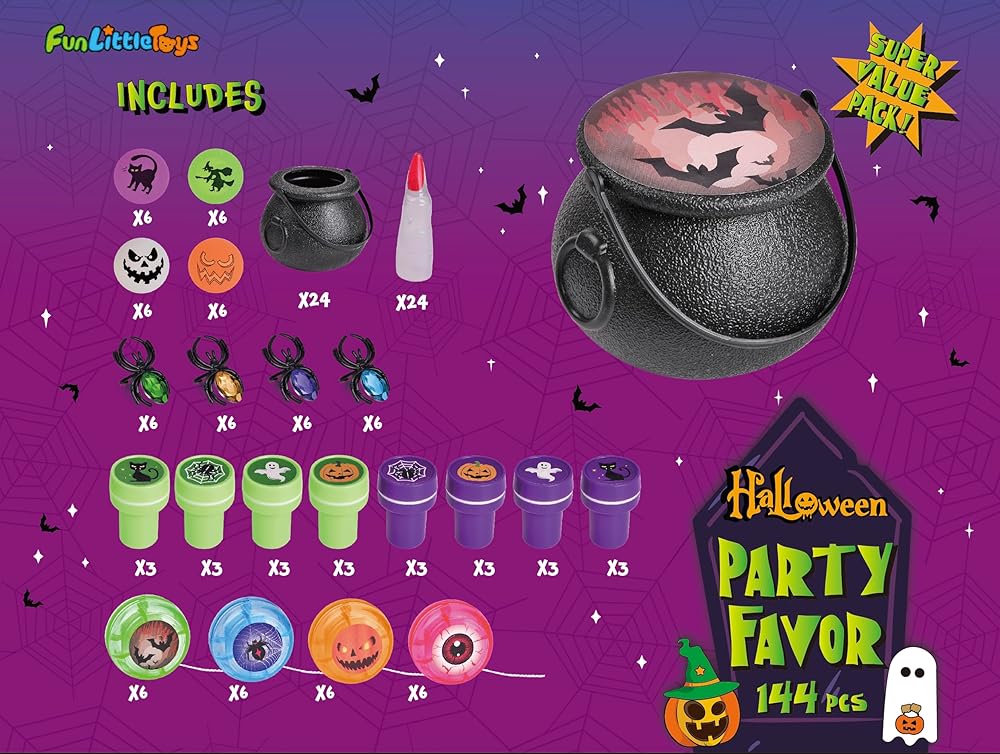 This set of halloween party favors has a total of 144 pieces including 24 small plastic witch cauldrons, 24 spider gem rings, 24 witch fingers, 24 yo-yos, 24 st-am-ps and 24 bouncy balls. These halloween toys give your playtime and parties up to big levels of excitement, fun, and laughter for all. Halloween party favors supplies