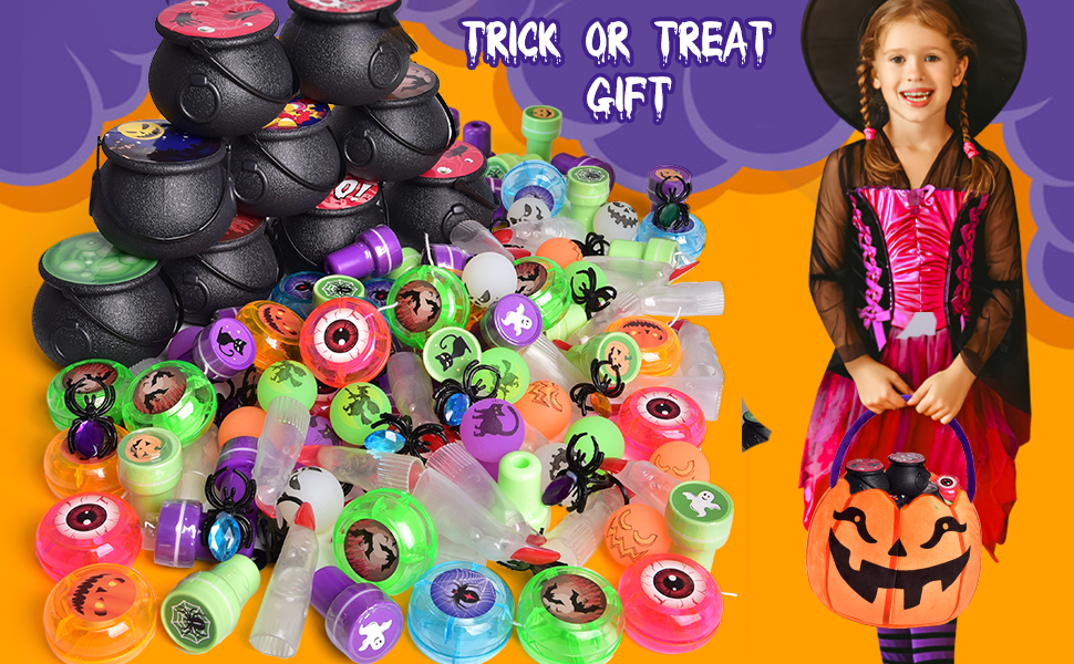 These prefilled mini cauldrons comes with stickers ,spider gem rings and fake witch fingers can be used as add-ons to your Halloween costume, st-am-ps for stamping different creatures on your hand, yo-yos and bouncy balls for playing, passing and catching. Halloween party favors supplies