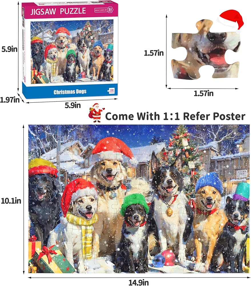 【Lovely 100 Piece Puzzles for Kids】-This is funny christmas jigsaw puzzles which characterizing christmas dog puzzle. Included 100 piece puzzle and a 1:1 reference poster that help the young children to finish the puzzle. Every piece is unique, complete cutting and fits perfectly. Kids puzzles 100 pieces finished size: 15 x 10 inch/38.1 x 25.4 cm. Funny puzzles for kids ages 6-8 puzzles for kids ages 8-10