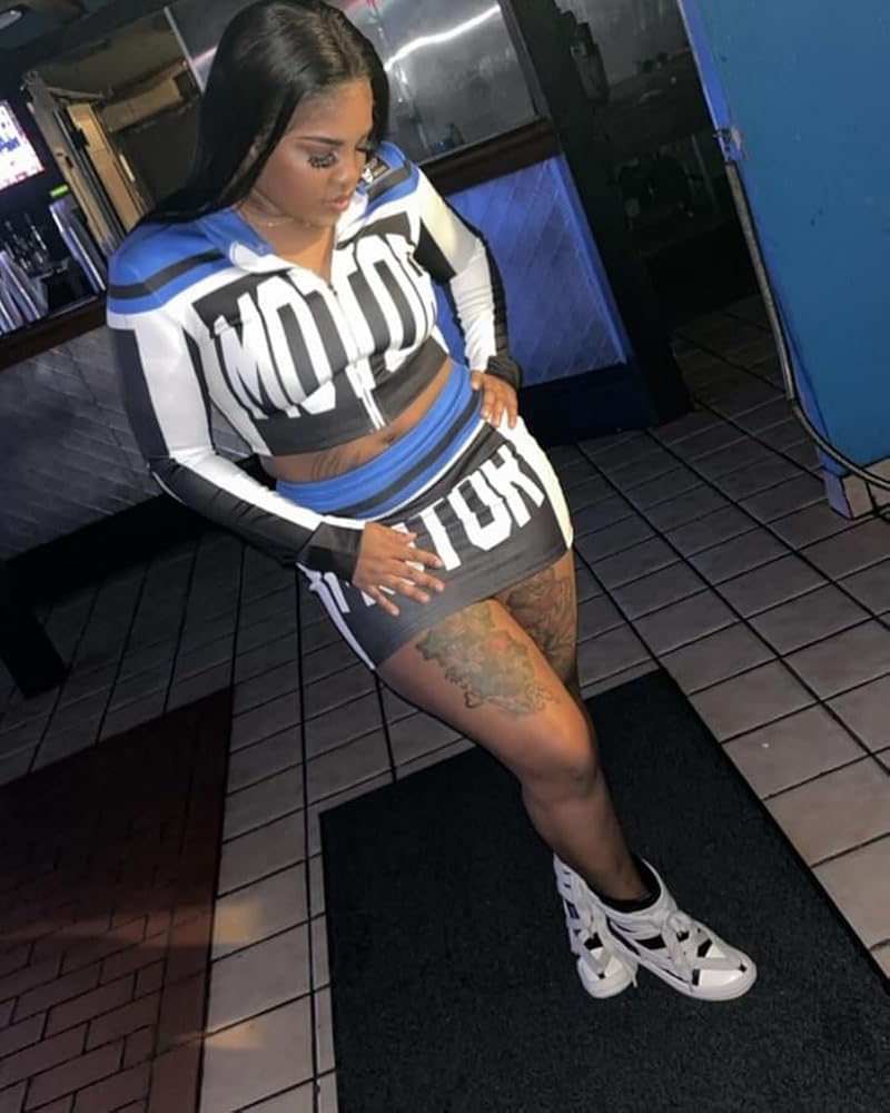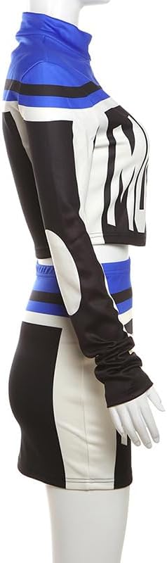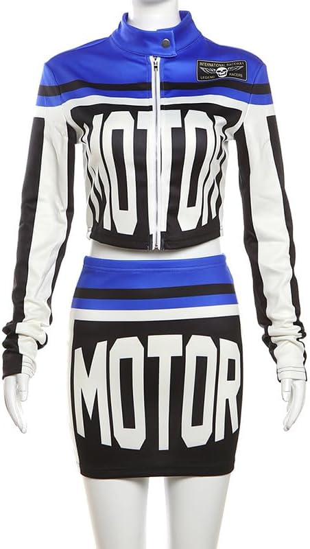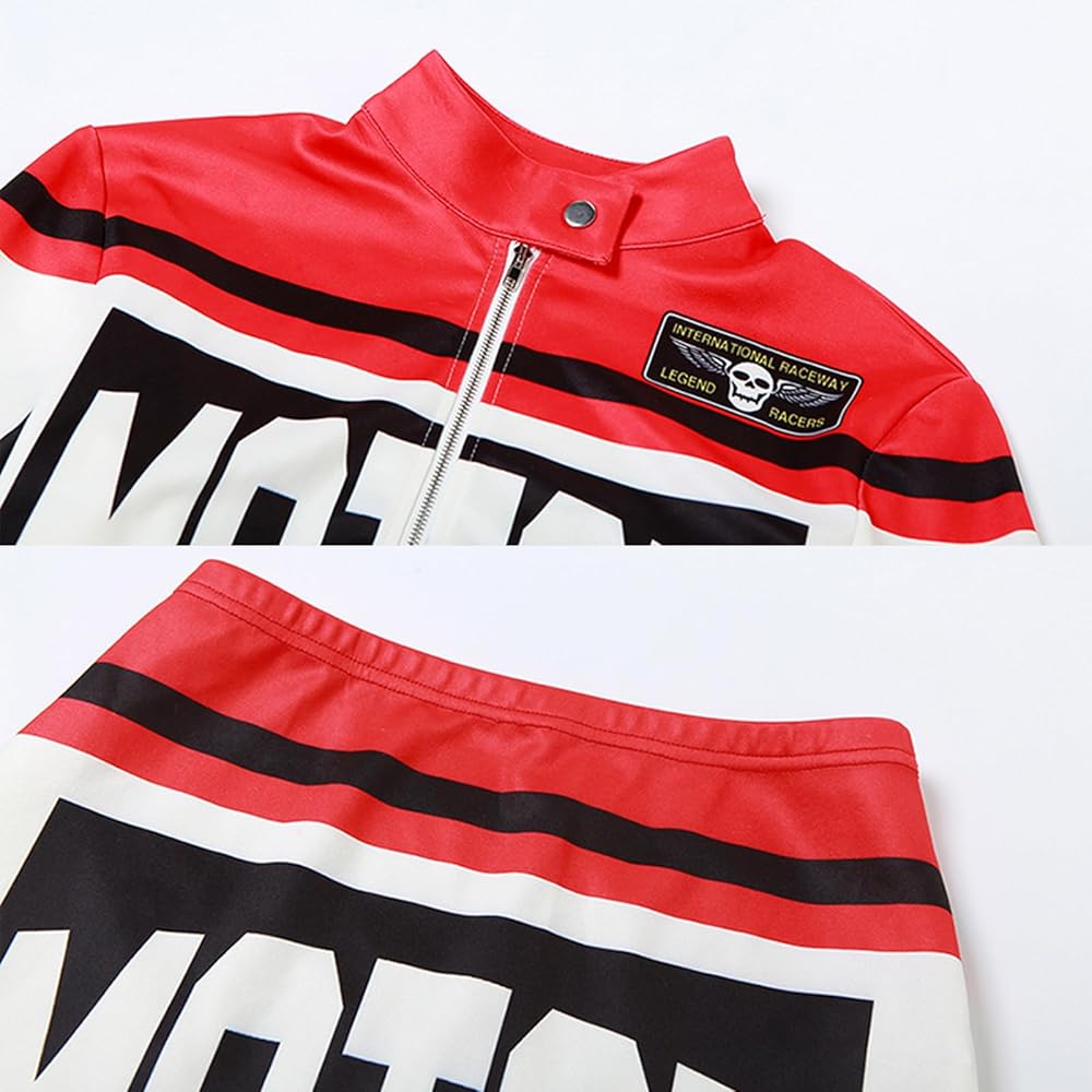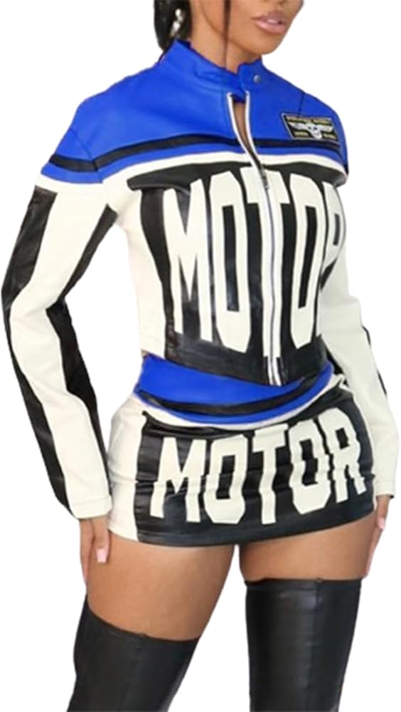 Features: Long sleeve jacket for women, Crop top , zipper jacket, mini skirt, letter print, two piece set for women, color patch, hip wrap skirt, street style, sexy two piece sets for women night out, women racer biker jacket, sexy 2 piece outfits for women clubwear y2k.