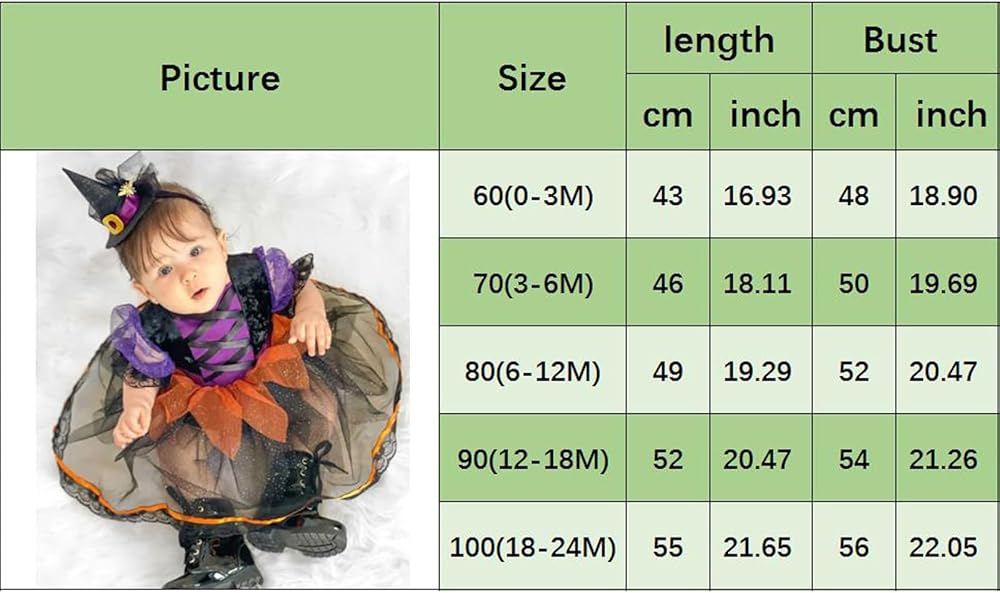 🎃🎃 Size: Fits for toddler infant newborn baby girls in 0-3months, 3-6 months, 6-12 months, 12-18 months,18-24 months. Please refer to the size chart before purchasing to bring the most comfortable wearing experience to your baby. Best gift for your baby in Halloween.