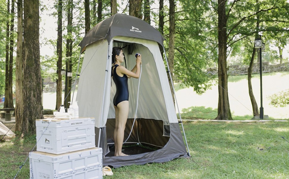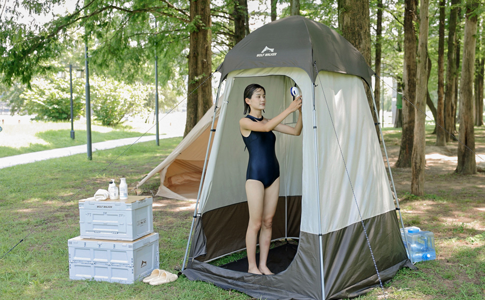 Best Privacy Room: A large zippered entry door provides easy access and 1 double-layered (cloth + mesh) windows , which can be closed or opened. Also, the mesh tent top with removable waterproof top rain fly. Both privacy and ventilation are very good. There are also storage bag inside for storing toiletries. Inside strap for hanging your changing clothes towel.