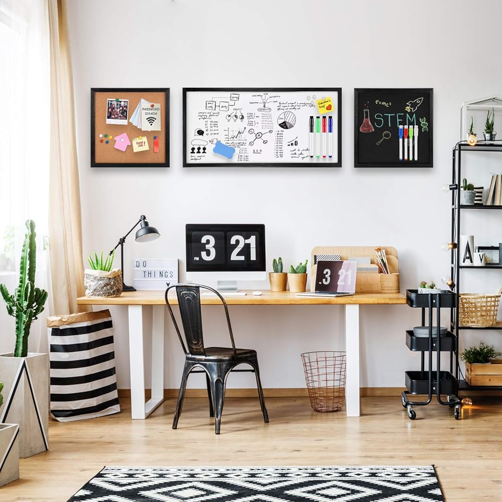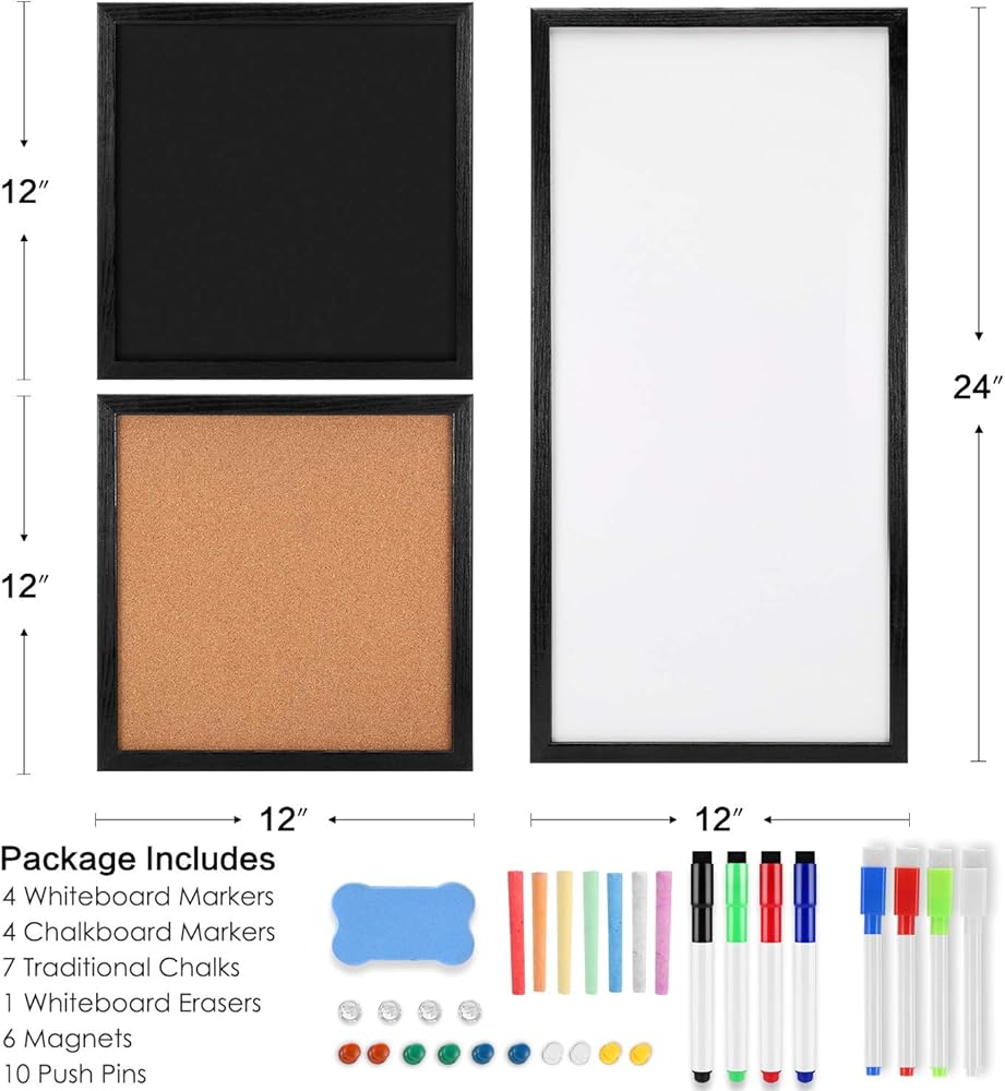 Dry Erase Whiteboard, Cork Bulletin Board, Chalkboard with Natural Wood Black Frame, 3 Pieces, 12" x 12" and 24" x 12", Combination Board 3 in 1 Free Style Mounted…