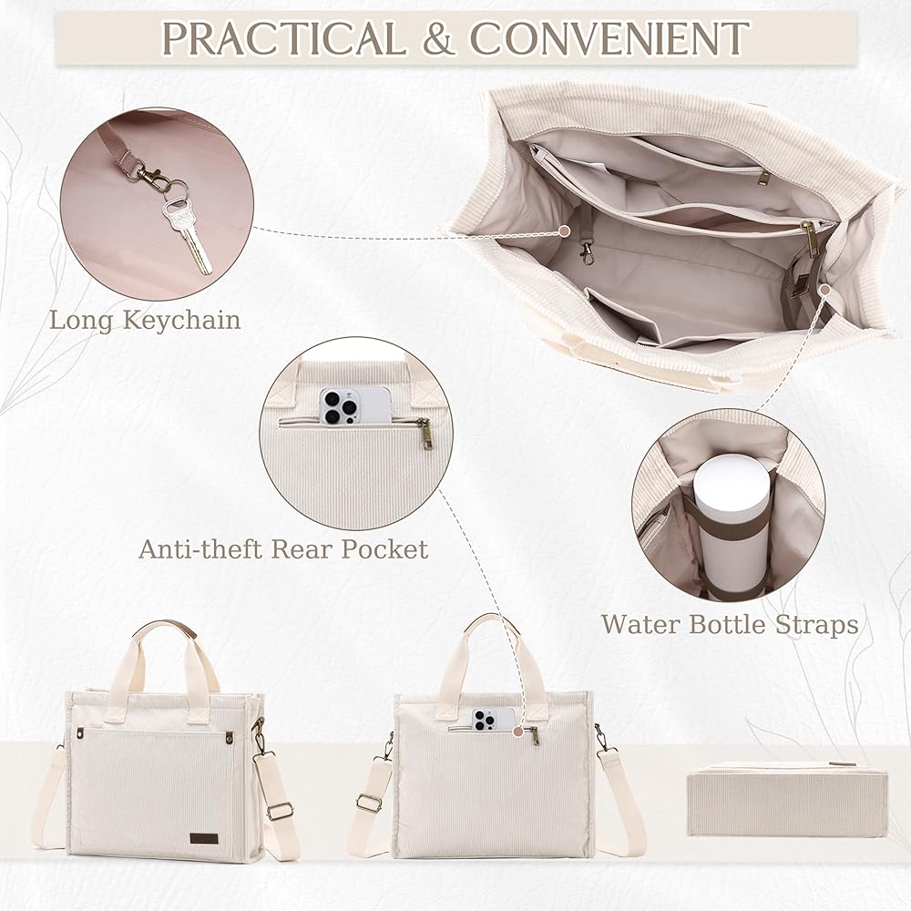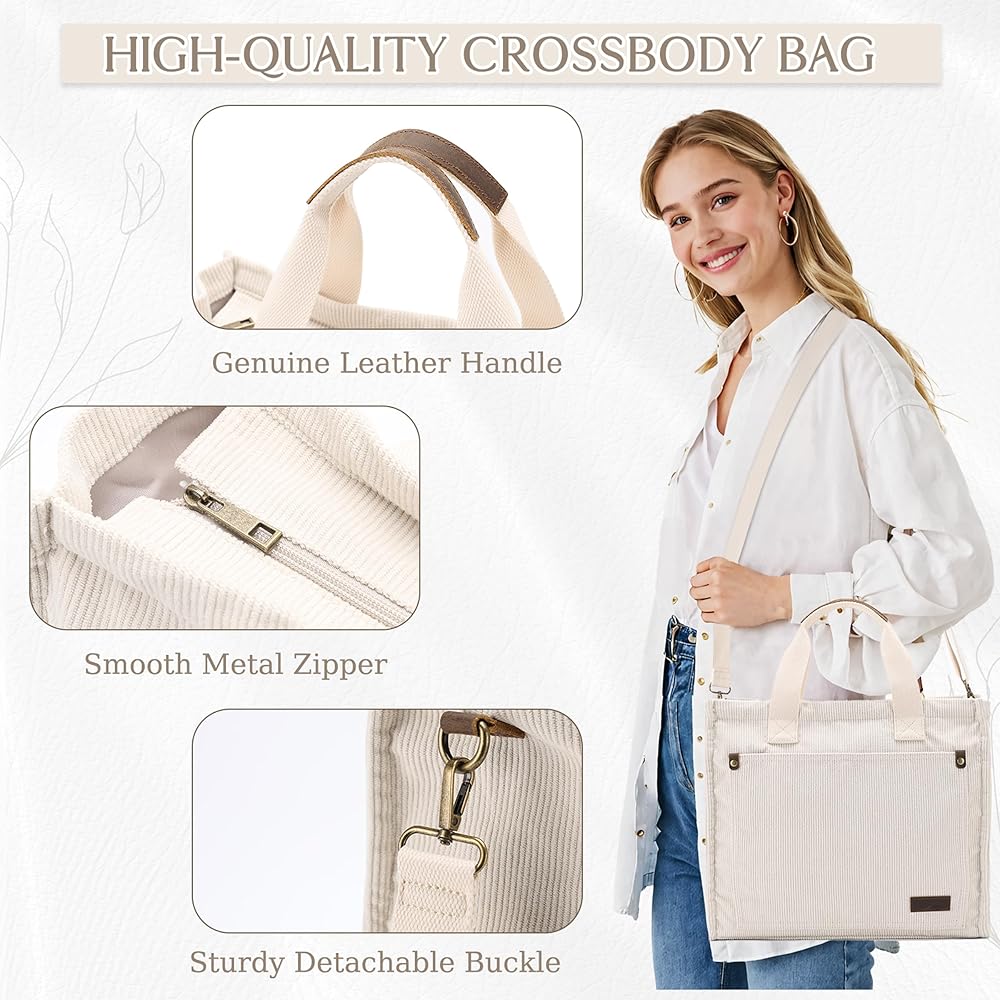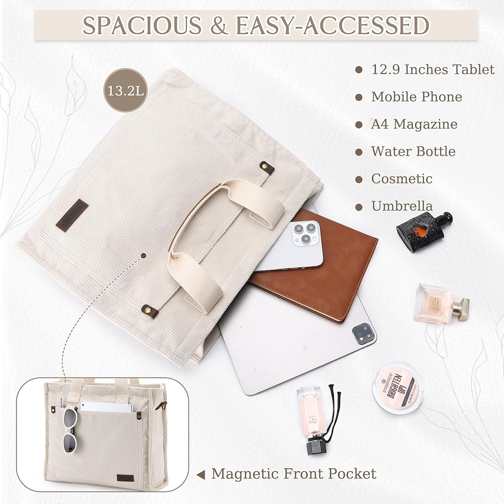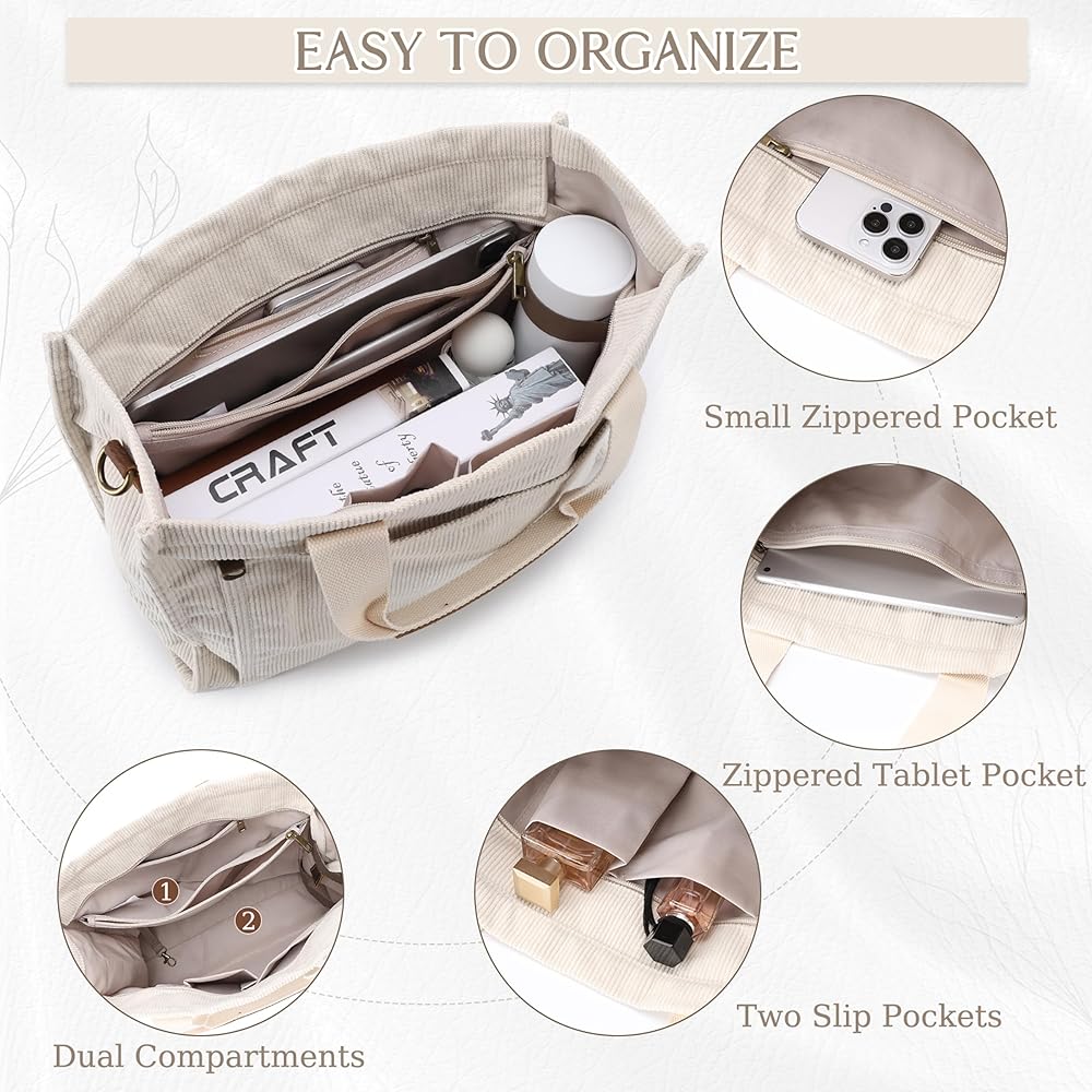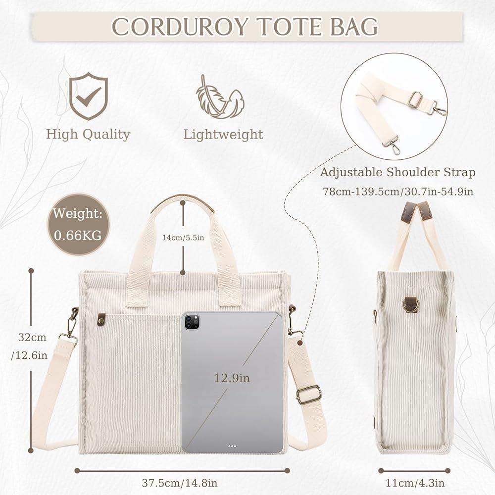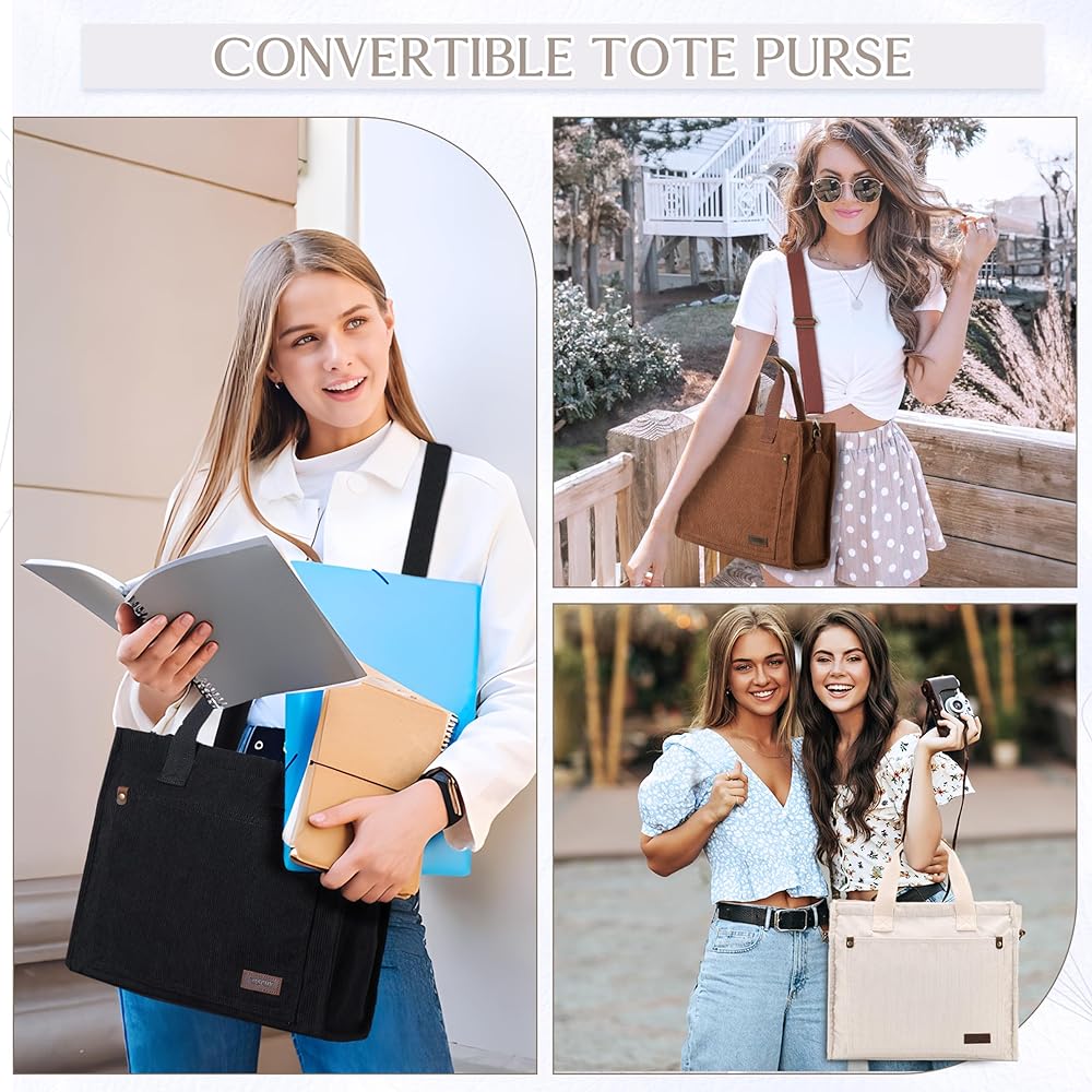⭐CONVENIENT & CONVERTIBLE: The medium-sized tote bag is made from soft and durable corduroy, easily to convert from a top handle tote purse to a crossbody shoulder bag with the detachable strap.