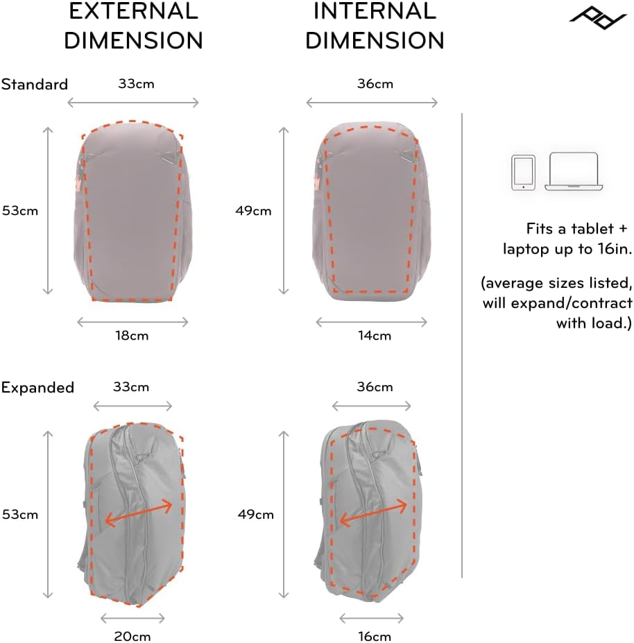 The smaller sibling of our iconic 45L Travel Backpack, the 30L is a rugged, expandable daypack ideal for shorter travel and everyday carry. A big, beautiful rear hatch provides total access for easy packing and unpacking. An enlarged top pocket is subdivided with stretch and zip pockets for keys, glasses, passport, etc. The weatherproof #10 UltraZip can withstand decades of use thanks to its proprietary abrasion-resistant thread. Meets international carry-on size requirements in expanded (33L) and compressed (27L) form. Expansive side pockets for water bottles, tripods, and more. Padded laptop + tablet sleeves. Tuck-away shoulder straps and optional hip belt accessory. 360-degree grab handles. Cleverly concealed external carry straps. All packed within a sleek, weatherproof 100% recycled 400D nylon canvas shell with 900D bottom liner. Fair Trade Certified and 100% carbon neutral. Works seamlessly with Peak Design Packing Cubes and Pouches, sold separately. Fits Peak Design Camera Cubes, but only in its expanded form. For optimal photo gear carry, we recommend the larger 45L Travel Backpack.