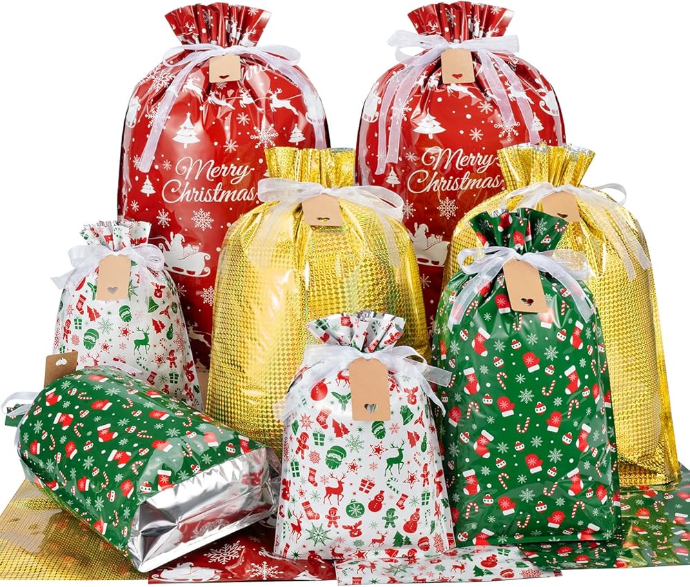 EASY & FAST DRAWSTRING DESIGN: Each Christmas gift bag comes with ribbon drawstring closure that can help you fast and easy to wrap your gifts and save gift time wrapping. Just insert the gift and pull on the tie and you're done wrapping. You don't need to worry about messing with wrapping paper and tape and scissors. Each bag opens with a wide stable bottom that really stands up while loading it with goodies for gifts, great for stacking under the Christmas tree