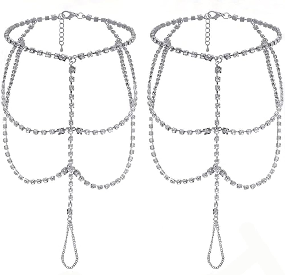 1Pair Summer Beach Rhinestone Barefoot Sandals Foot Chain with Toe Ring Bikini Crystal Anklets Bracelet Wedding Bridal Rhinestone Anklet Foot Chain Jewelry for Women