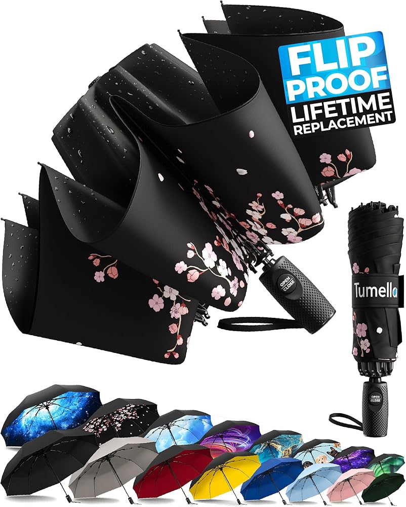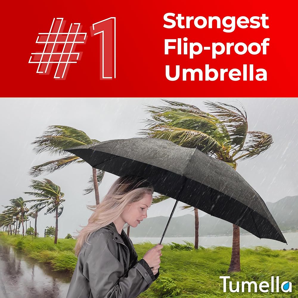 • DISCOVER THE STRONGEST, 2024 UPGRADED FLIP-PROOF UMBRELLA Say goodbye to the embarrassment of an umbrella for rain that flips, leaving you soaked instead of protecting you. Tumella developed this inverted travel umbrella to limit its risk of flipping. With 9 sturdy ribs, a high-quality canopy, and a flip-resistant design, this large umbrella (46") won't let you down in the next downpour.