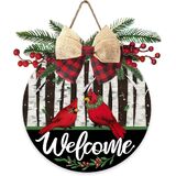 Deroro Welcome Christmas Cardinal Front Door Sign, Xmas Red Bird Snowy Forest Wood Door Hanger Outdoor Outside Porch Decor, Rustic Wooden Wreath with Bow Red Berry Indoor Wall Hanging Decoration