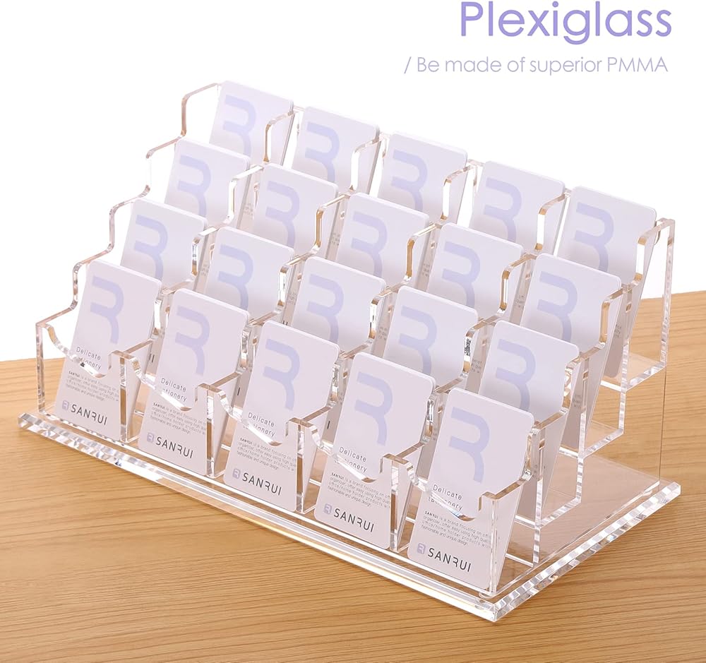 Unlike plastic business card holders, all of SANRUI's acrylic business card holders are made of thicked material, which is not easy to be yellowed or deformed; the sturdy support feet design keeps the business card holders stable on the desktop.