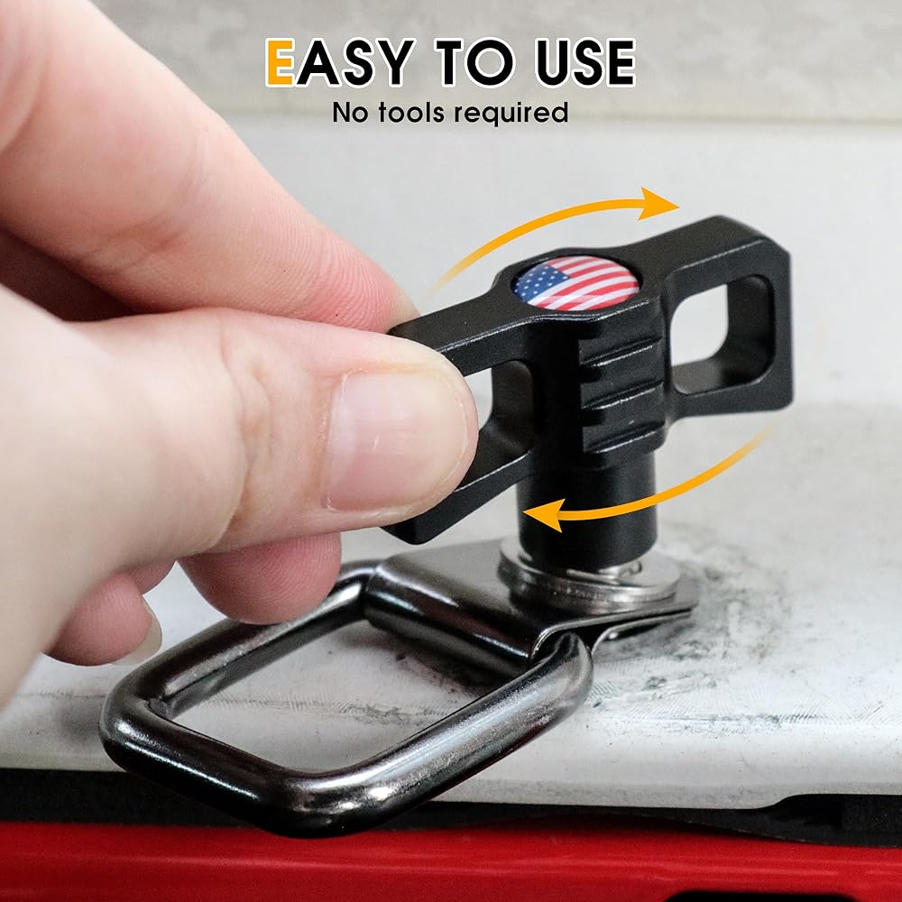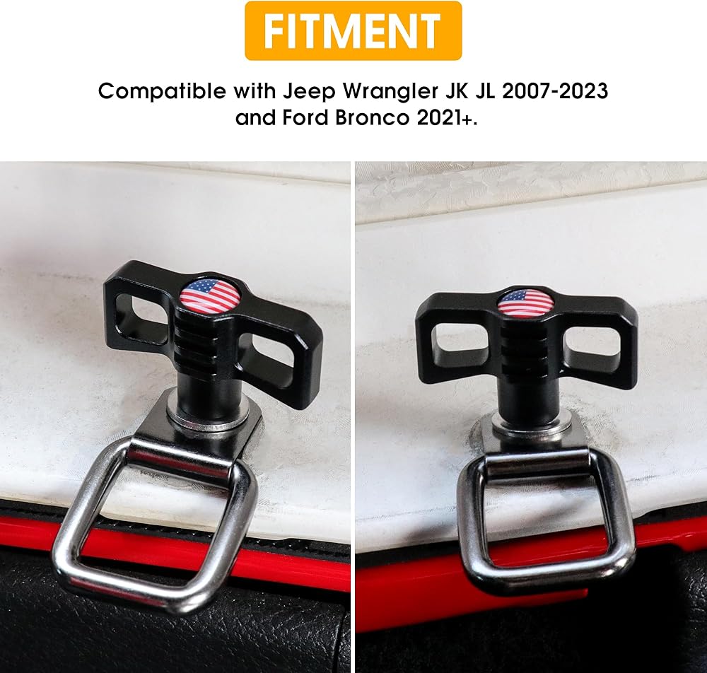 Fitment: Hardtop Quick Removal Thumb Screws Nuts compatible with Jeep Wrangler 1997-2024 TJJK JL Sahara Rubicon Freedom Sports X 2/4 doors, and Ford Bronco 2021+. The hardtop bolts are M8 type. D-rings can swivel and set to any angle after tighten down
