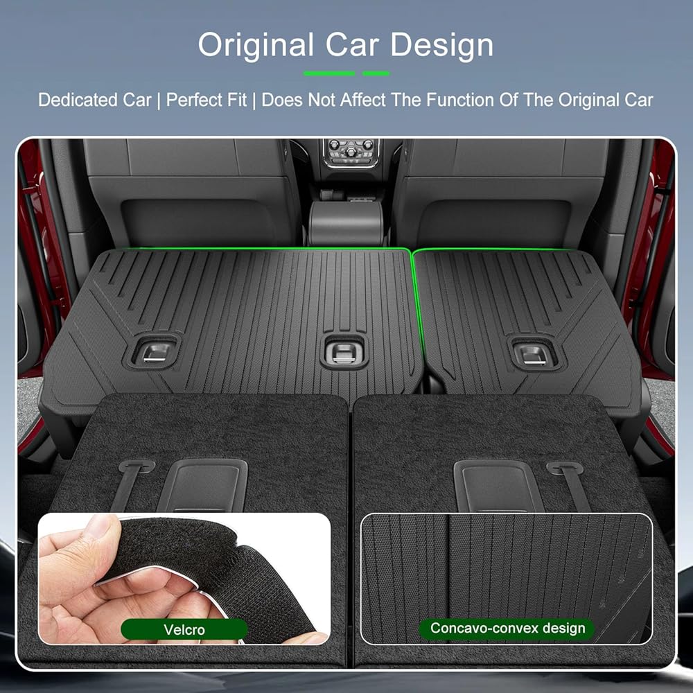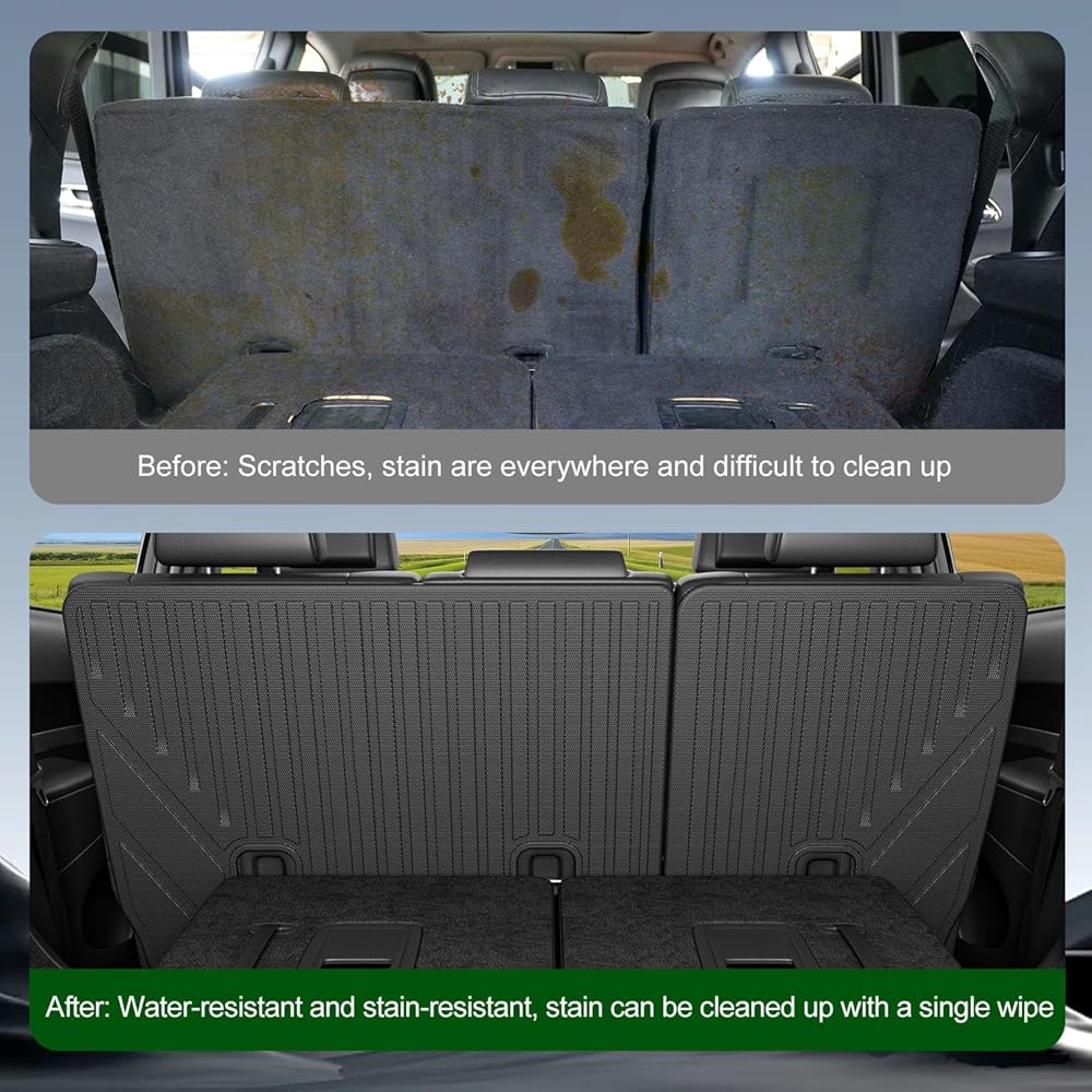Multiple Function:The cargo mats protect your third-row seat back and trunk,and offers practical protection against dirt,mud,and pet hair.They also change the appearance of your vehicle.The mat can keep your car's interior clean and tidy. The floor mats provide protection for your vehicle's flooring.The rice grain pattern enhances friction and keeps seat back from scratches.This mat is easy to clean,just wipe with a damp rag or rinse with water.