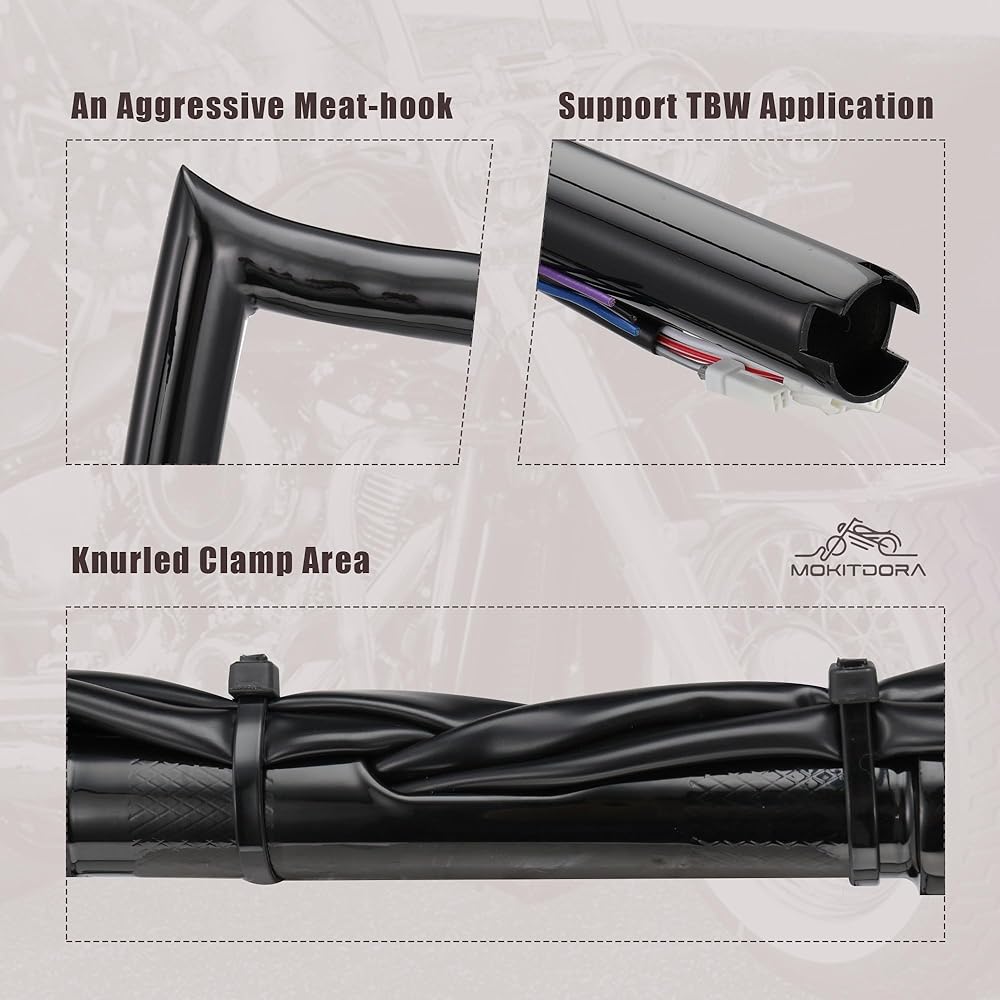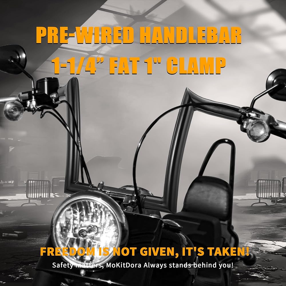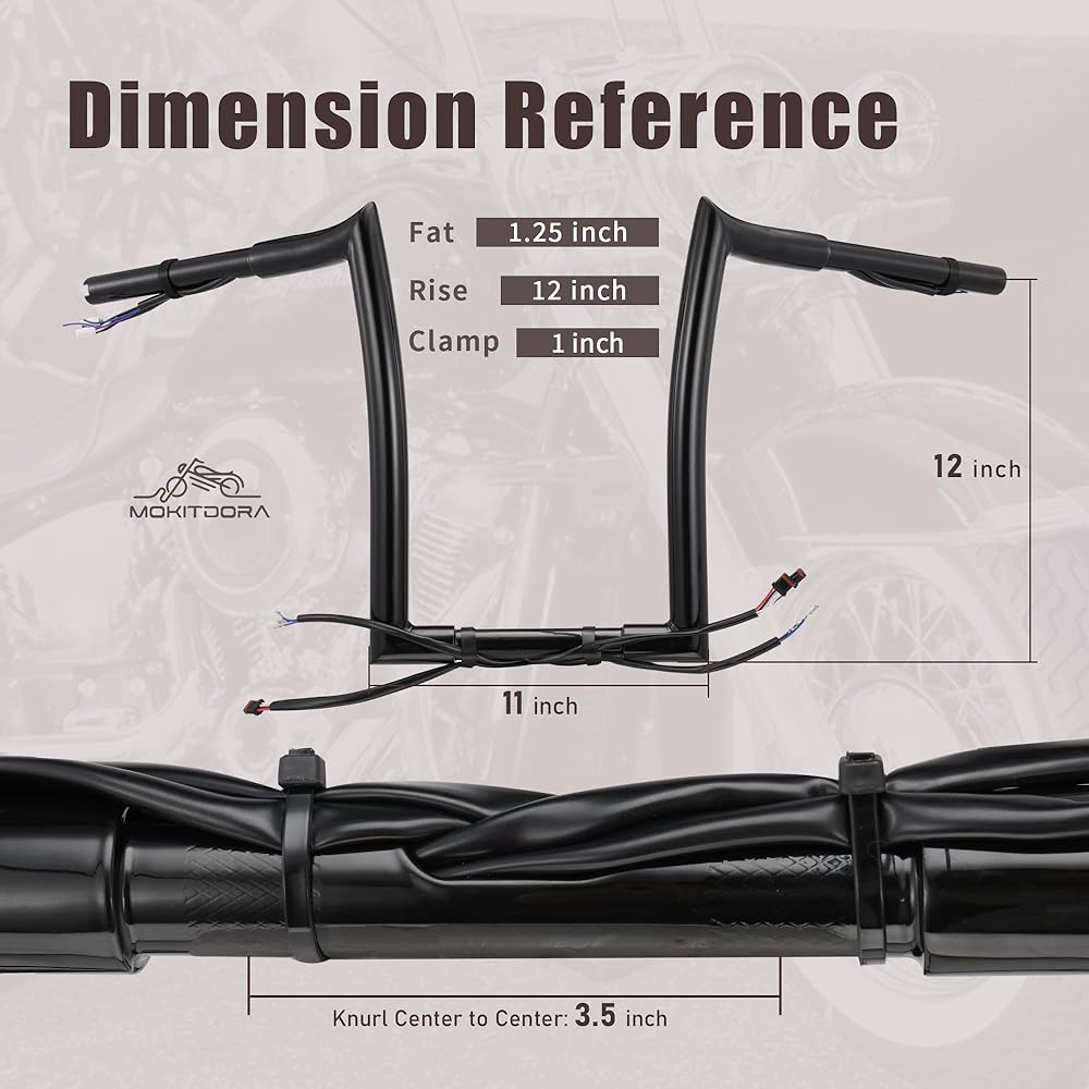 Fitment - This 12" rise pre-wired handlebar fits 2014-up Sportster XL, 2012-2017 Dyna Street Bob Super Glide Softail Heritage Deluxe Slim Models, compatible with all the stock cables & and controls