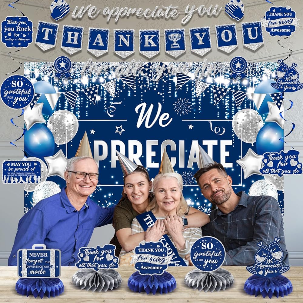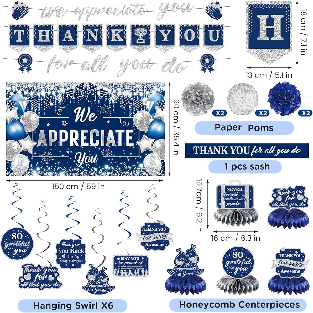 Package Include:The blue gold appreciate decoration kit includes a we appreciate you banner backdrop + 3 piece thank you for all you do banner pennant + 5 piece appreciate you honeycomb centerpieces + 6 piece blue gold we appreciate you hanging swirls + 6 piece blue gold tissue paper pom poms + 1 piece thank you sash, nice set for your decoration