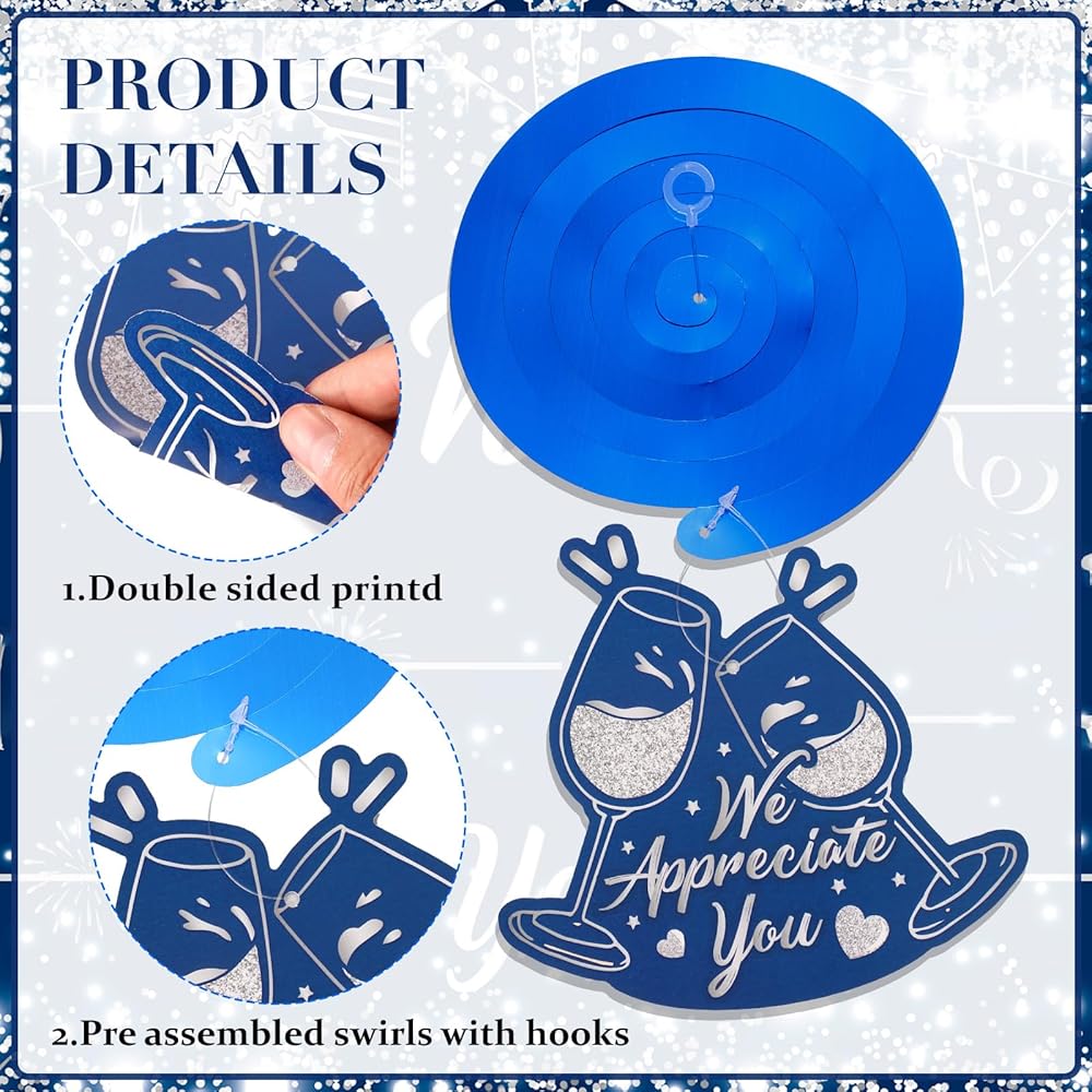 We Appreciate You Decorations:These thank you for all you do decorations are designed with rich blue gold appreciate patterns, "We Appreciate You" banner, "Thank You" and "For All You Do" hanging swirls and honeycombs in the shape of gift, star, and other shapes, the shiny thank you sash and interesting blue gold tissue paper pom poms, make your party glittering and unforgettable