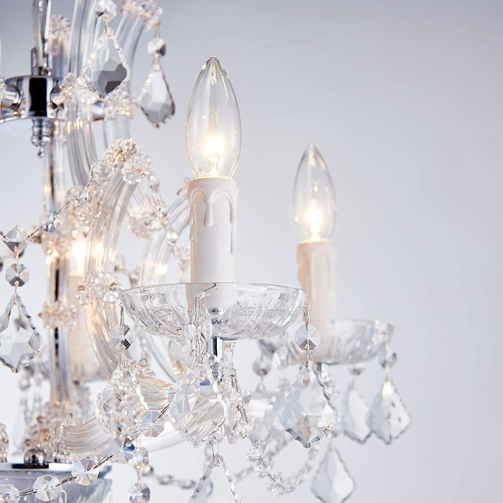 The lamp size of this crystal chandelier is 17" in height, 18" in width, and 18" in depth. It requires 4 x E12 bulbs (not included in the package), with a maximum power of 40W per bulb. This chandelier is compatible with LED bulbs, allowing for cost and energy savings.