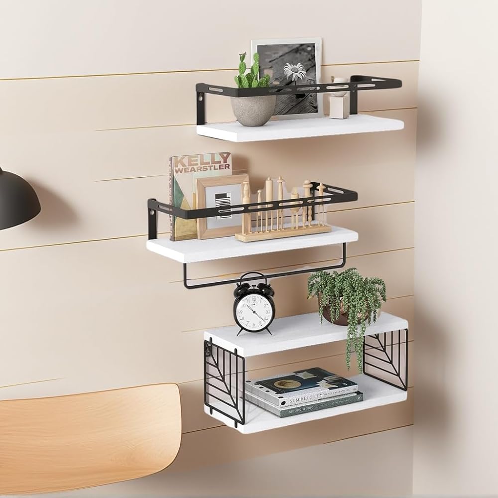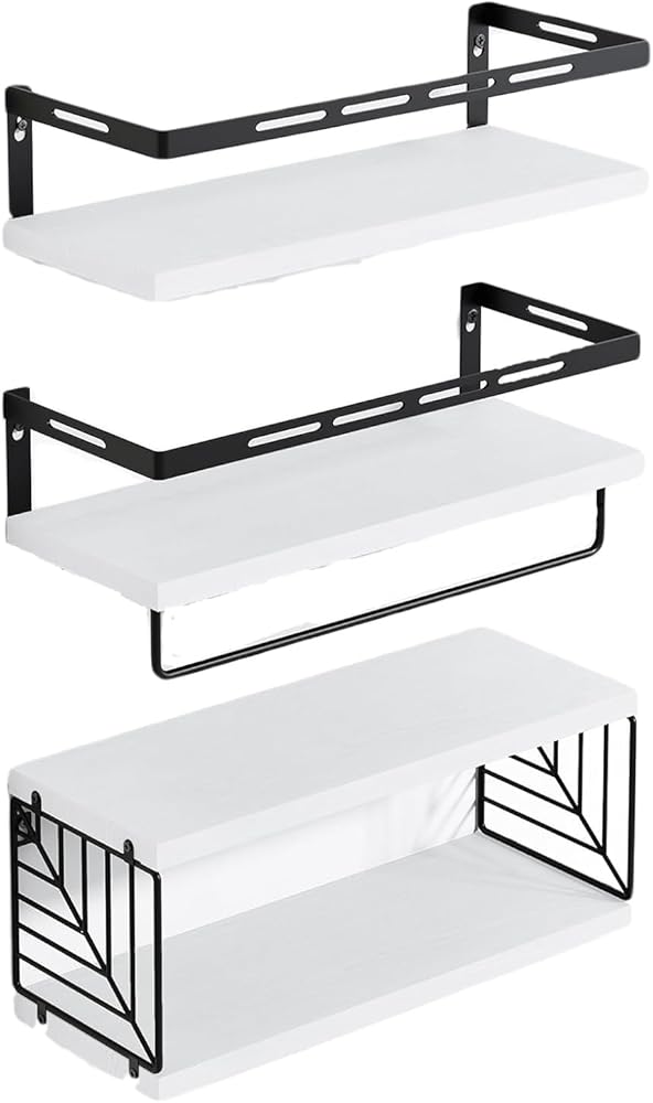 Bathroom Shelves Over Toilet Wall Mounted Floating Shelves 3+1 Rustic Wood Floating Shelves with Metal Frame and Towel Bar for Bathroom, Living Room,Bedroom and Kitchen (White, Leaf Grid)