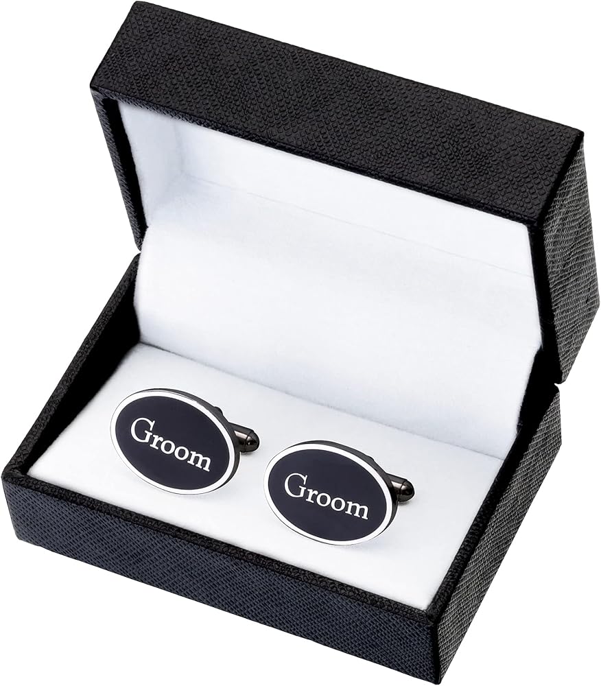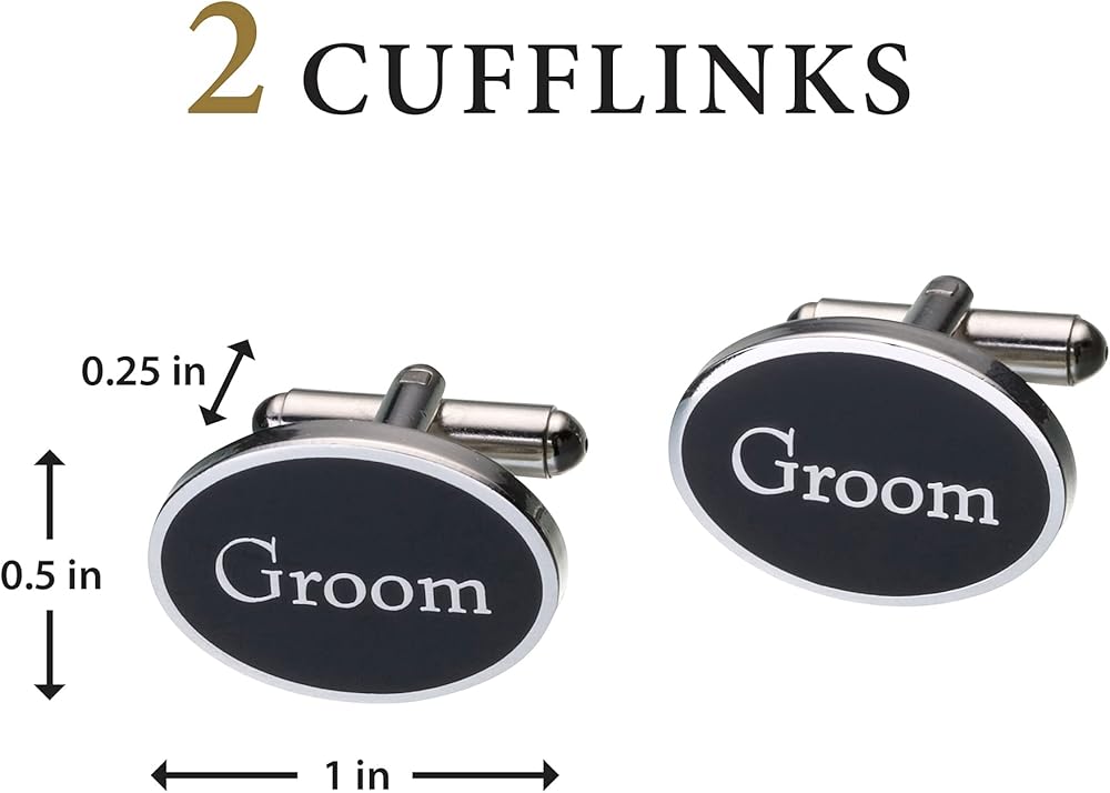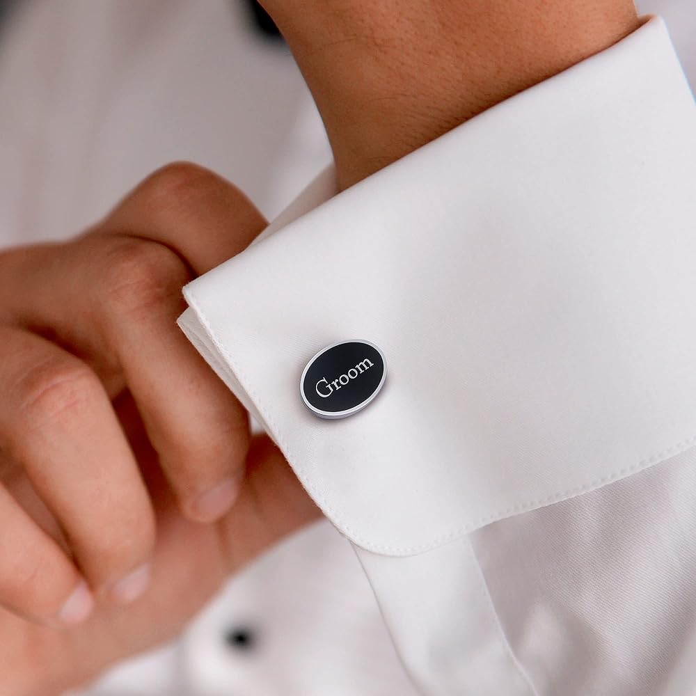 Lillian Rose father of the groom cufflinks. This pair of 1" black cufflinks with silver plating is a great personal touch for the "father of the groom." available in bm (best man), fb (father of the bride), FG (father of the groom), gm (groomsman), GR (groom).
