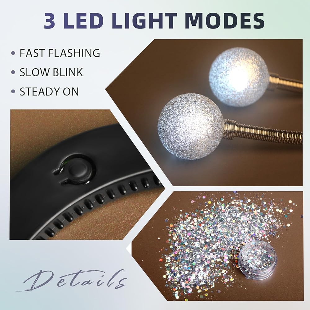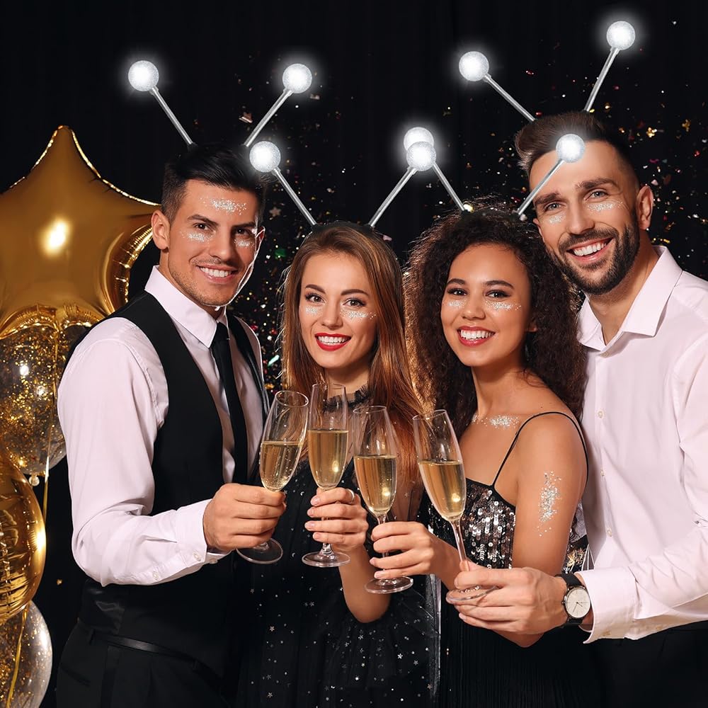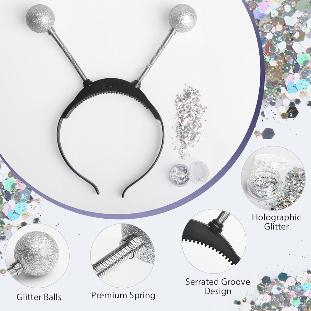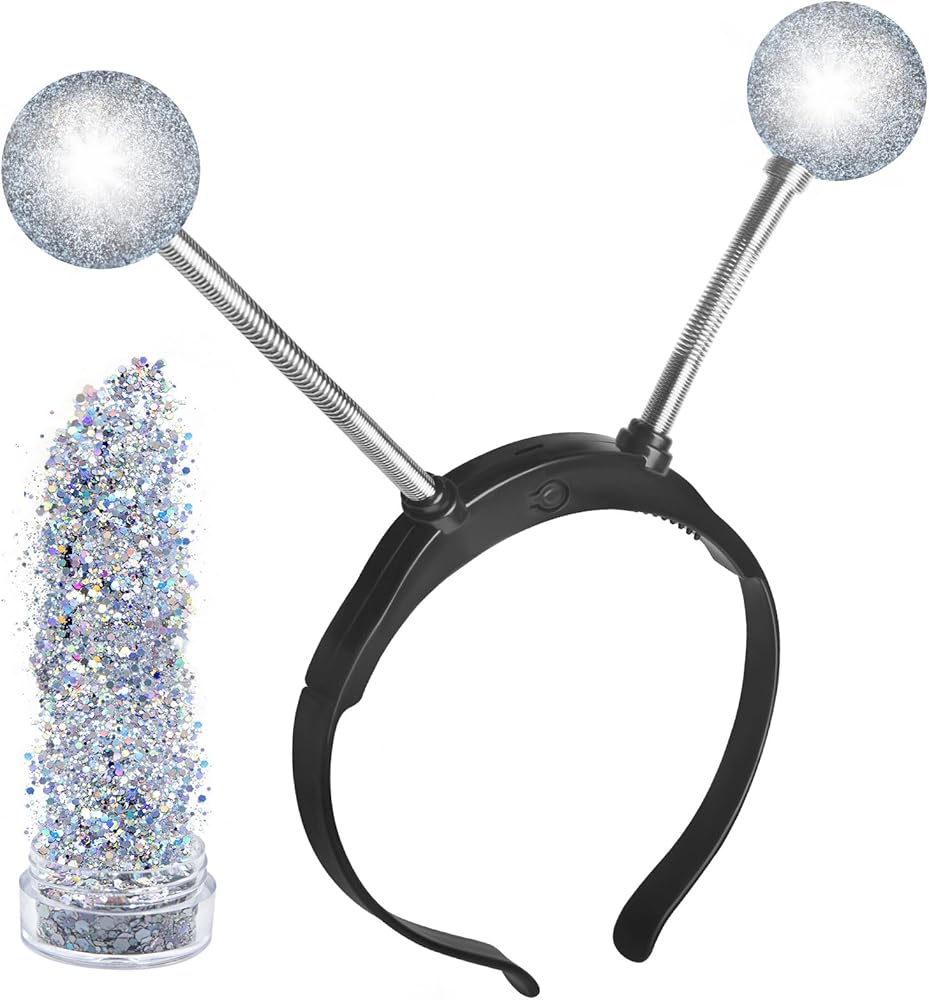 LIGHT UP ALIEN HEADBAND WITH FACE GLITTER - The Halloween alien headband set comes with 1 x Light Up Alien Headband and 1 x Face Glitter. With LED lights on them, the glowing headband with the face glitter has good effect at night, it will complete your space women's jeans with beautiful touch, which will be attractive of the alien role-playing party.