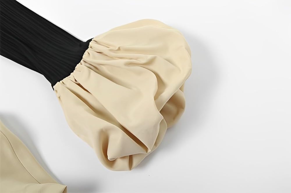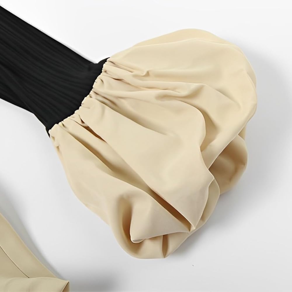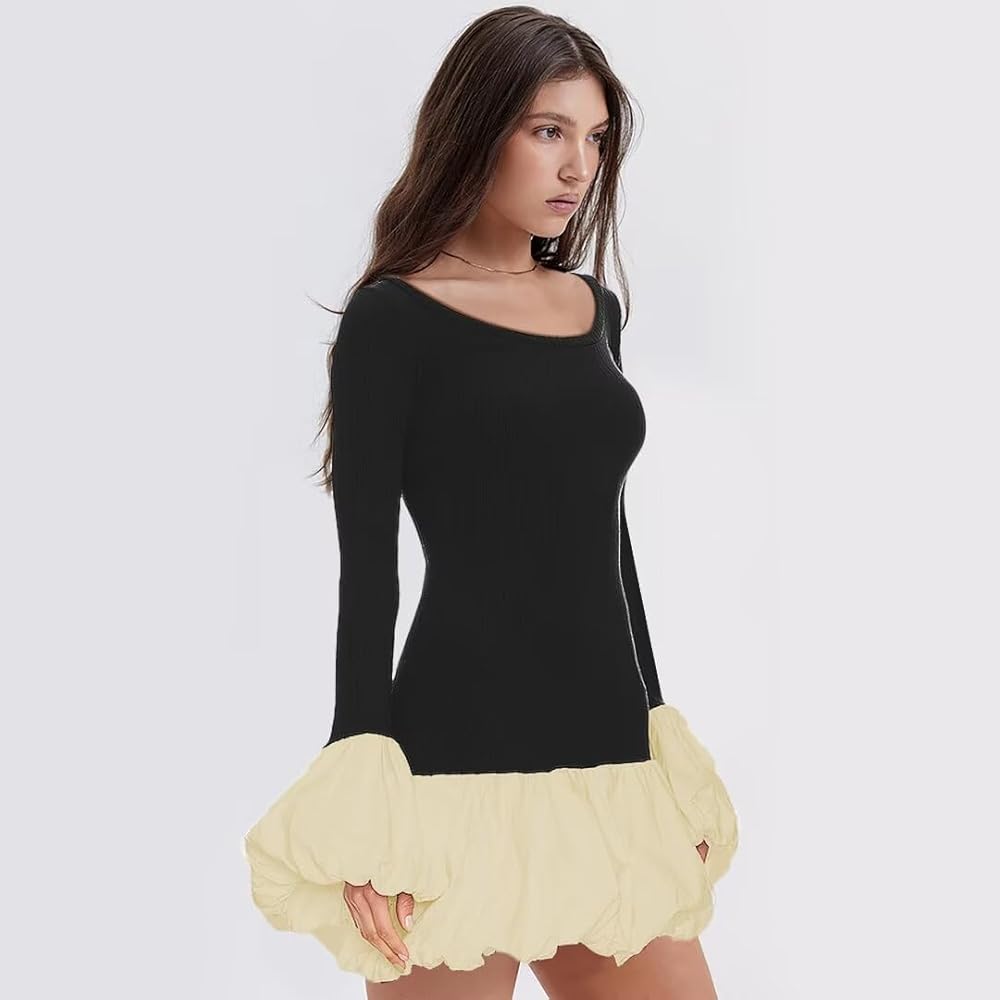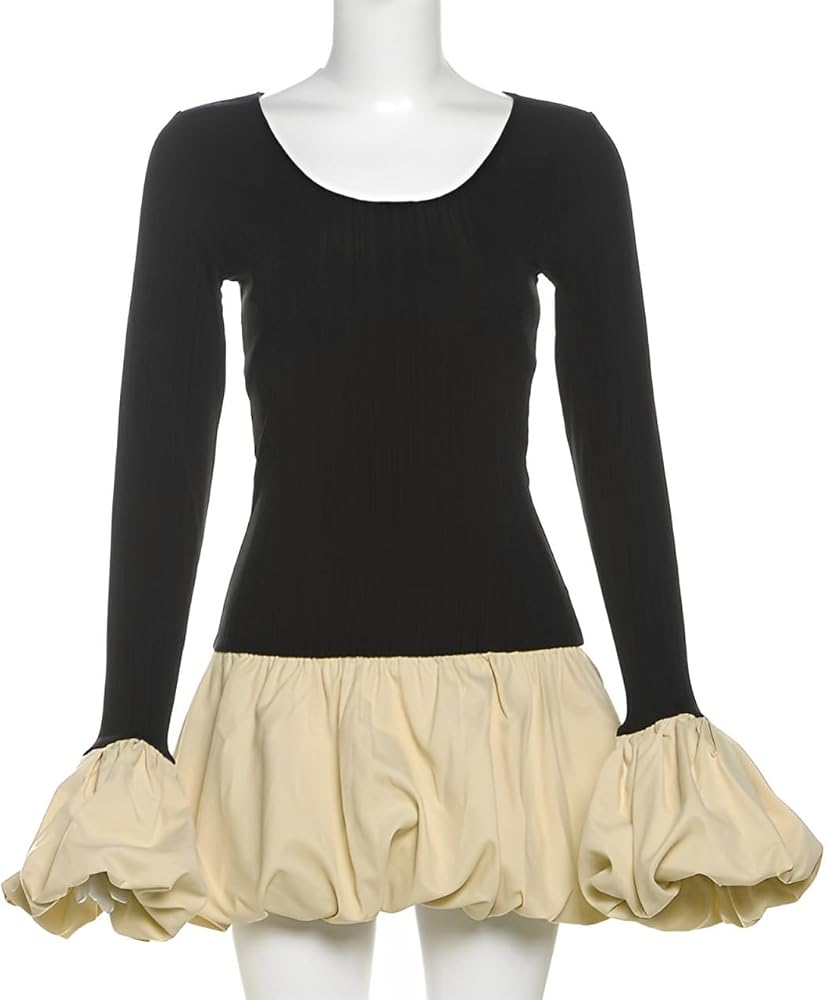 【DESIGN】 The patchwork dress features with crew neck, puff sleeve, flared sleeve, long sleeve, slim fit, low waist bubble skirt, figure-flattering mini length. fall dresses for women 2024, going out dresses for women, fit and flare dress for women, drop waist dress, wedding guest dresses for women.