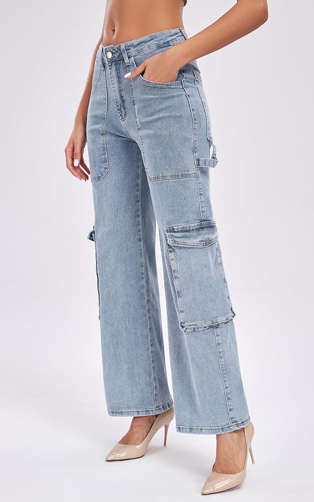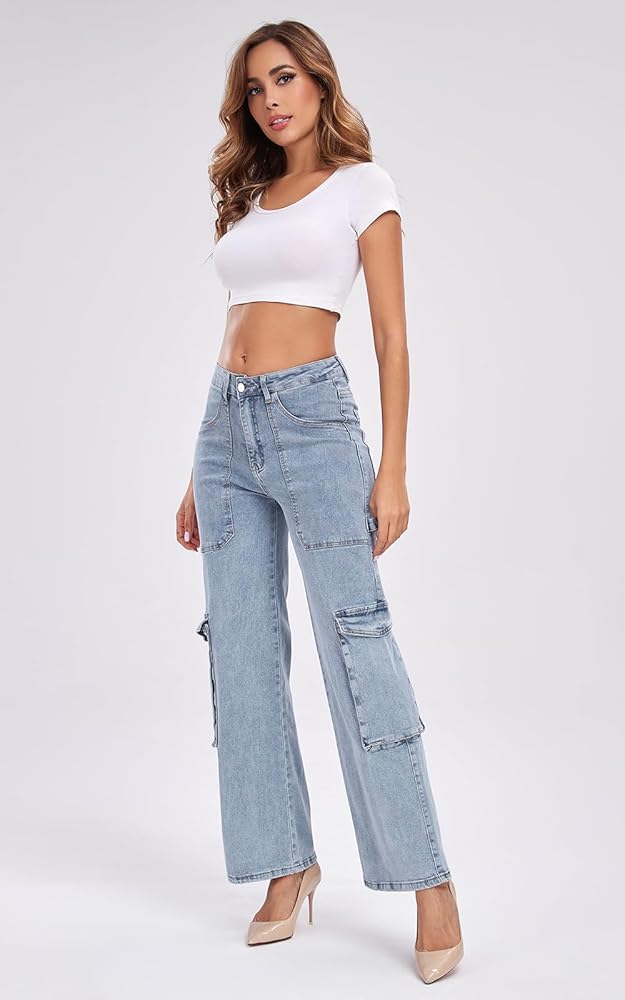 【PRO Stretchy Comfy Jean Fabric】: These cargo Jeans for women are crafted from a stretch, durable,skin friendly, and breathable fabric, promising you comfort and durability. 4-way stretchy for this denim pants ,can be stretched 1.3-1.5 times, more tolerant of your thighs, fit any body type, suitable for all-day wear.