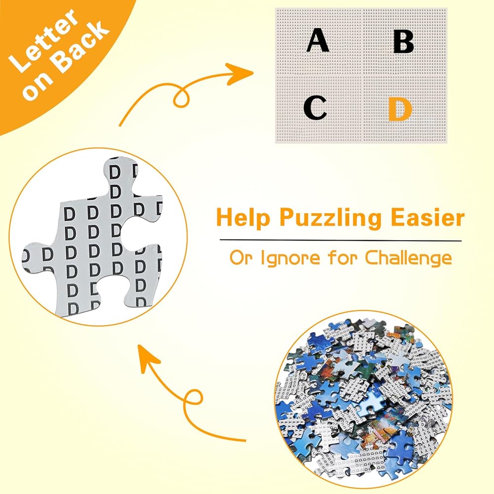 Start Different Levels: The pieces of mat puzzle have letters on the back, showing the quadrant of the puzzle which the pieces belong in, help you work easier. Even you can complete directly on the poster. Of course you can ignore them for more difficult level.