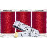 Sew-All Thread. Each of Gutermann's threads is manufactured to a high specification offering excellent abrasion resistance and are guaranteed knot-free. Sew-all thread offers, a premium thread that will sew every type of fabric and a huge color range too. The Gutermann reel offers: tall reel with cross-wound thread (for a smooth and even pull off), non-cellophane reel (allows for an accurate shade match), removable tie-off facility (winding the loose end of thread around the tie off facility ensures that thread is kept clean and neat in the work basket and should the end of the thread become lost the whole end plate can be removed for retrieval, clear labeling (each end label indicates the shade number and bar code and has a perforated center section ensuring that once used, the label portion containing the information remains intact. This package contains 3 Gutermann Sew-All Thread 547yd/500m spools of 100% polyester thread and 1 Bella's Crafts soft tape measure