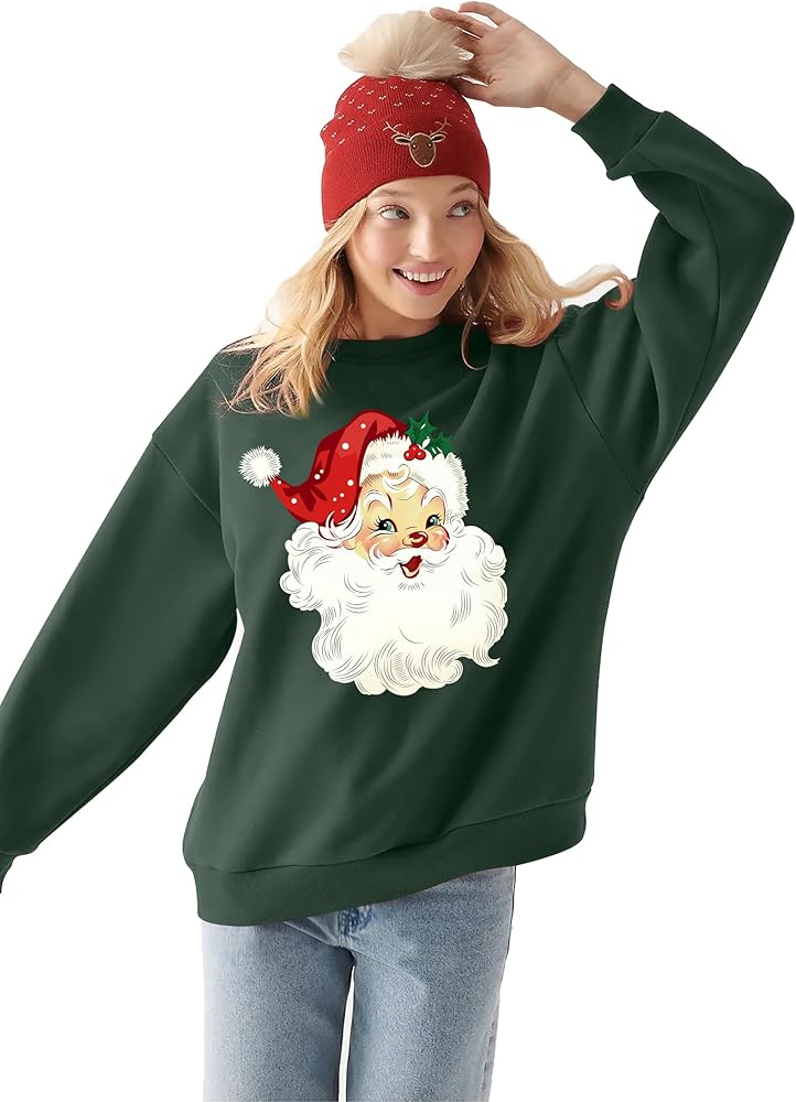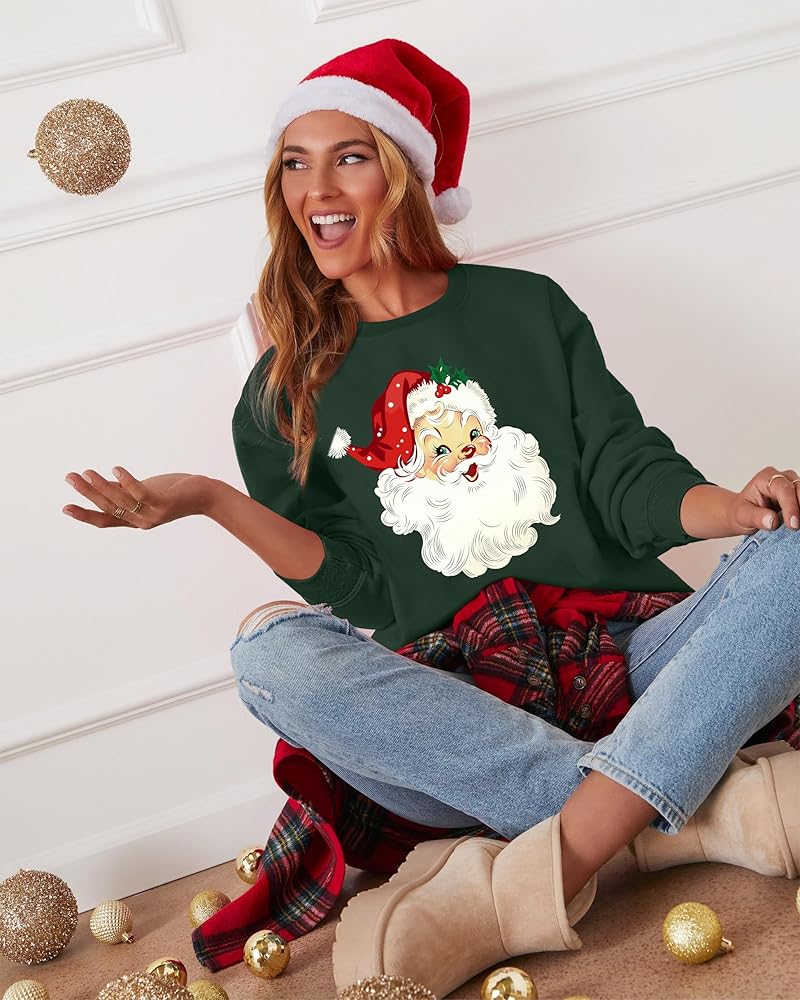 DESIGN: Santa Claus Graphic Sweatshirt, Christmas Santa Printed Sweater, Christmas Party Sweatshirt, Retro Santa Long Sleeve Shirt, Xmas Holiday Tops, Classic Crew Neck Pullover, Loose Fit, Winter Casual Holiday Long Sleeve Shirts