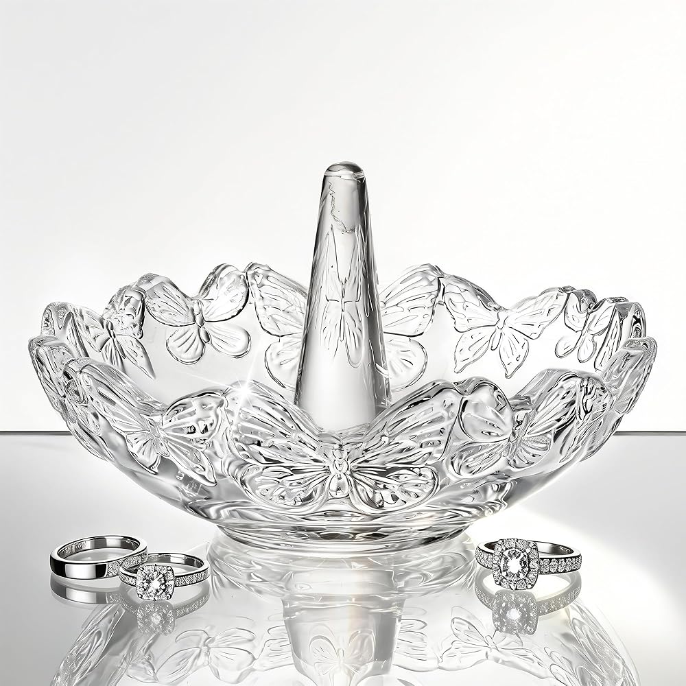 Ring Holder for Jewelry: Using high grade K9 crystal as raw material, so shiny that it will reflect bright spots in the sun. Exquisite shape with carefully carved,which is deeply loved by ladies. Material: Crystal. Size: 2.3" H x 3.1" W