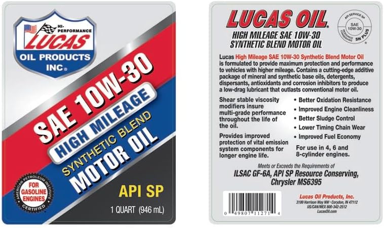 Lucas Oil Synthetic Blend High Mileage SAE 10w-30 Motor Oil_ API SP 1 Quart (Pack of 1)