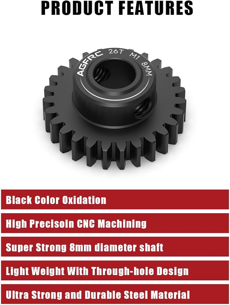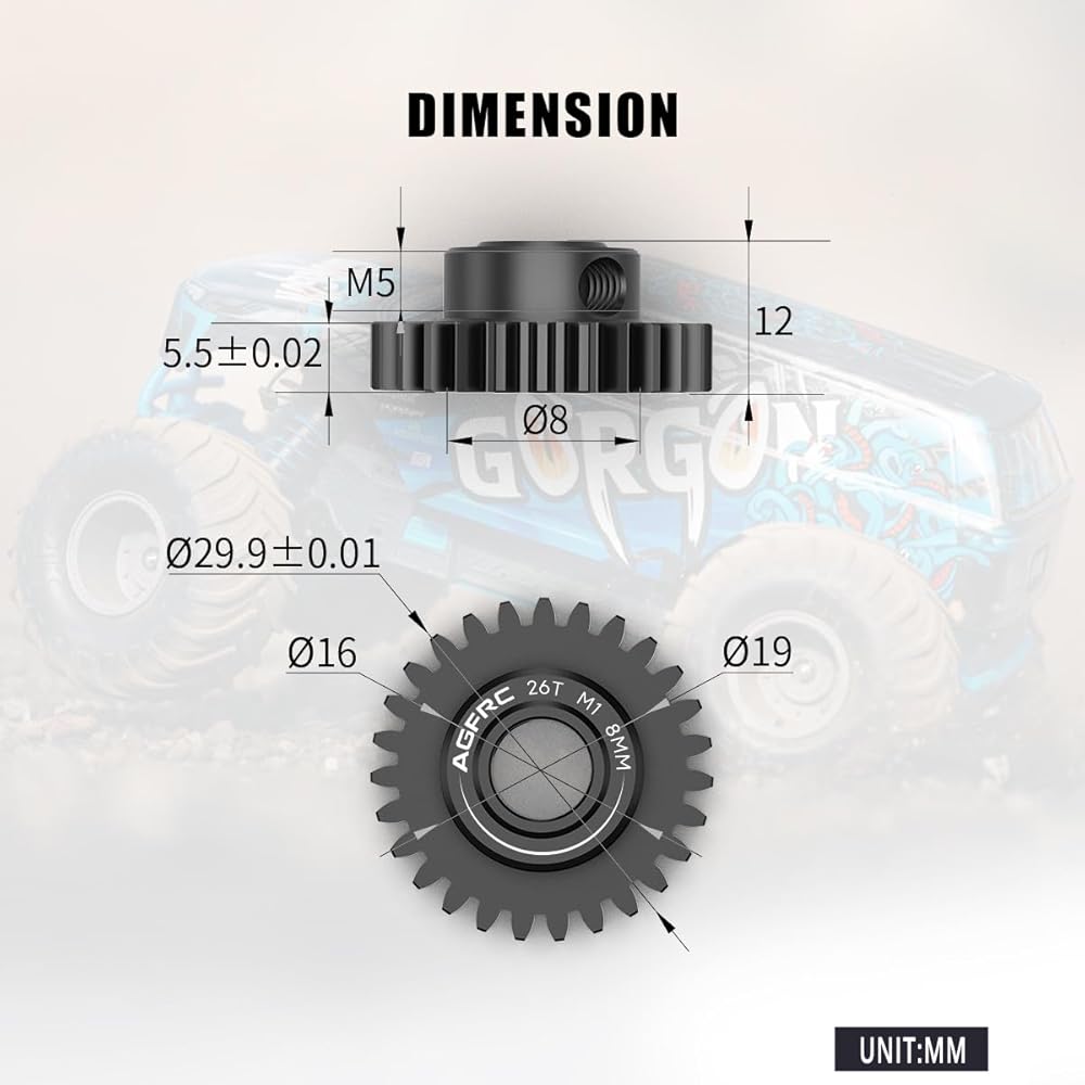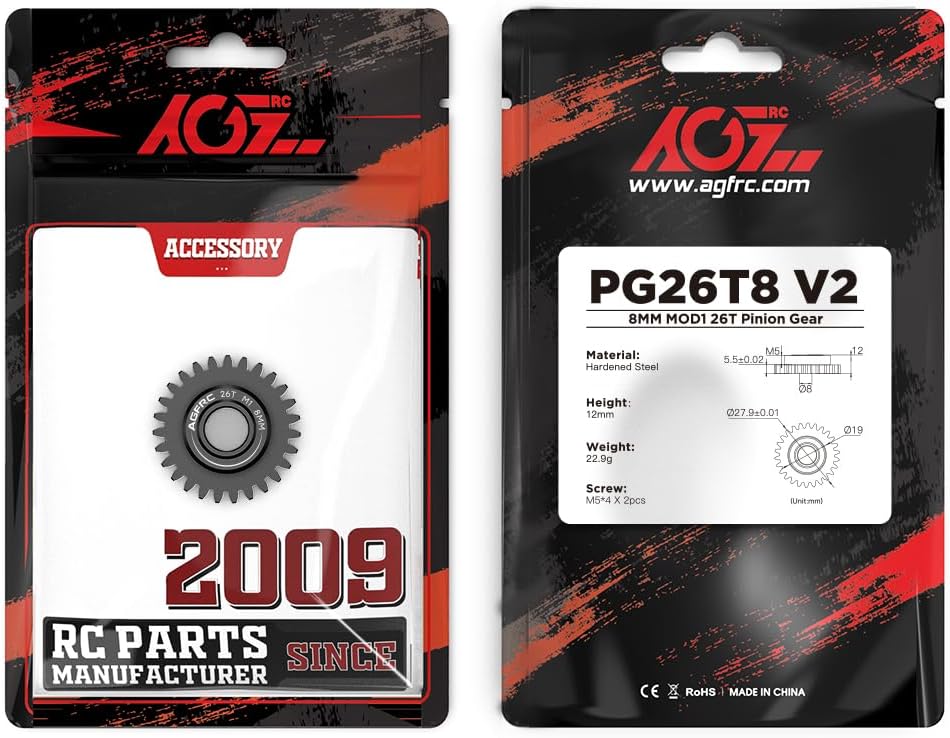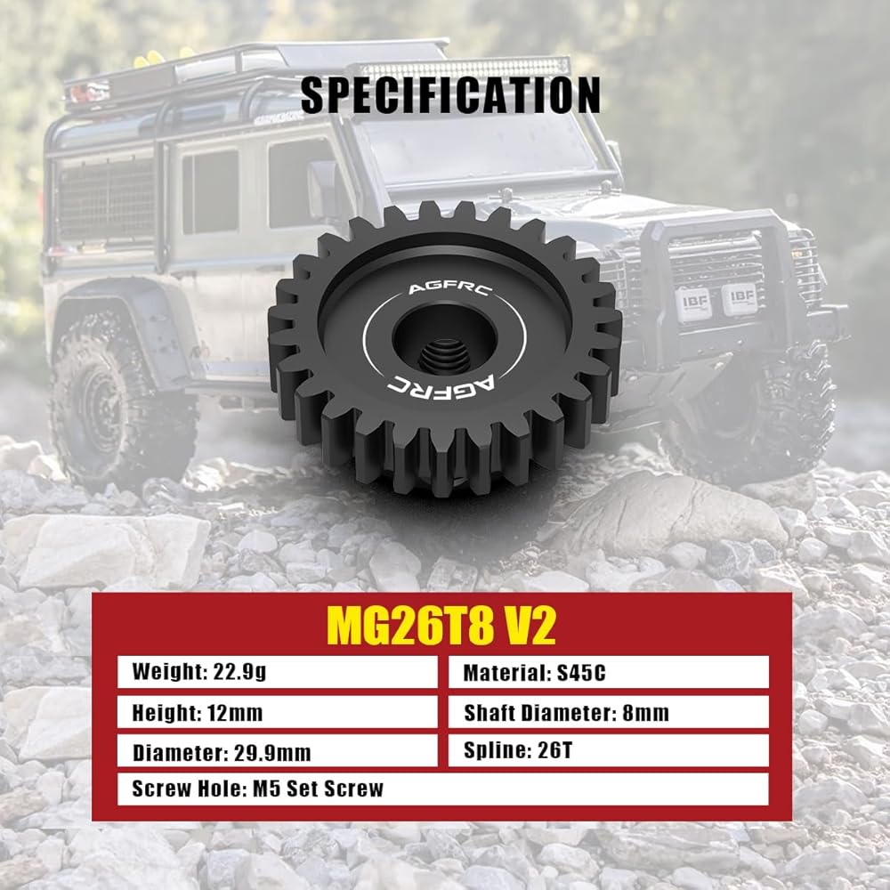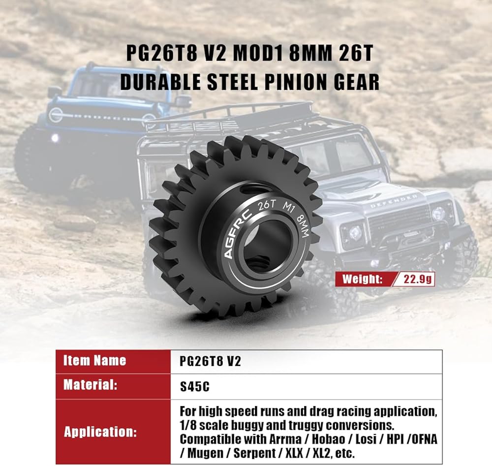 AGFRC PG38T8 V2 hardened steel gear allows to fine turn the gearing of your vehicle, which comes with 2pcs M5 set screws with for extra secure tight fitting. Perfect for high speed runs and drag racing application, 1/8 scale buggy and truggy conversions.